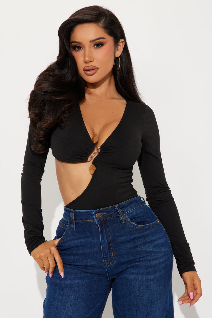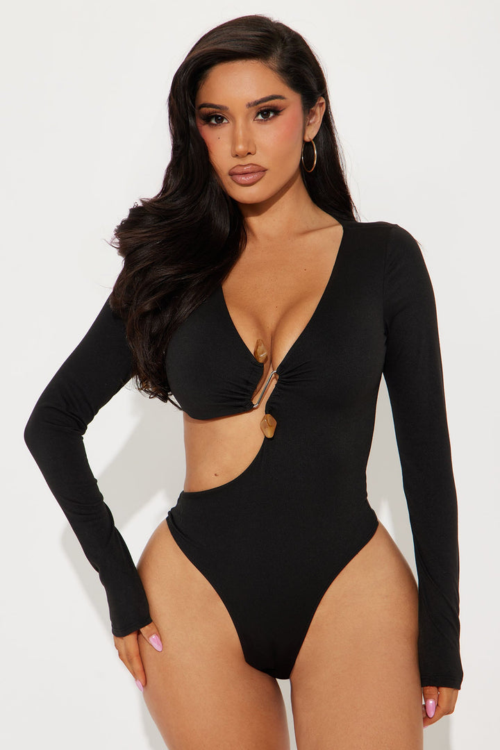 Available In Black And Wine. | Bodysuit | Long Sleeve | Hardware Detail | Cut Out Detail | Thong Bottom | Snap Button Closure | Final Sale | 95% Polyester 5% Spandex | Imported