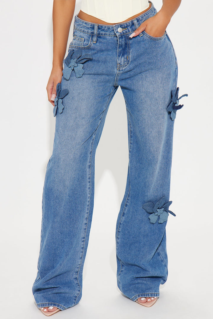 Available In Medium Wash. | Wide Leg Jean | 5 Pocket | Applique Flower Details | 10.5" High Rise | Available In Medium Wash. | Non Stretch | Disclaimer Due to the Wash Process, Each Garment Is Unique. | 93% Cotton 4% Polyester 3% Viscose | Imported