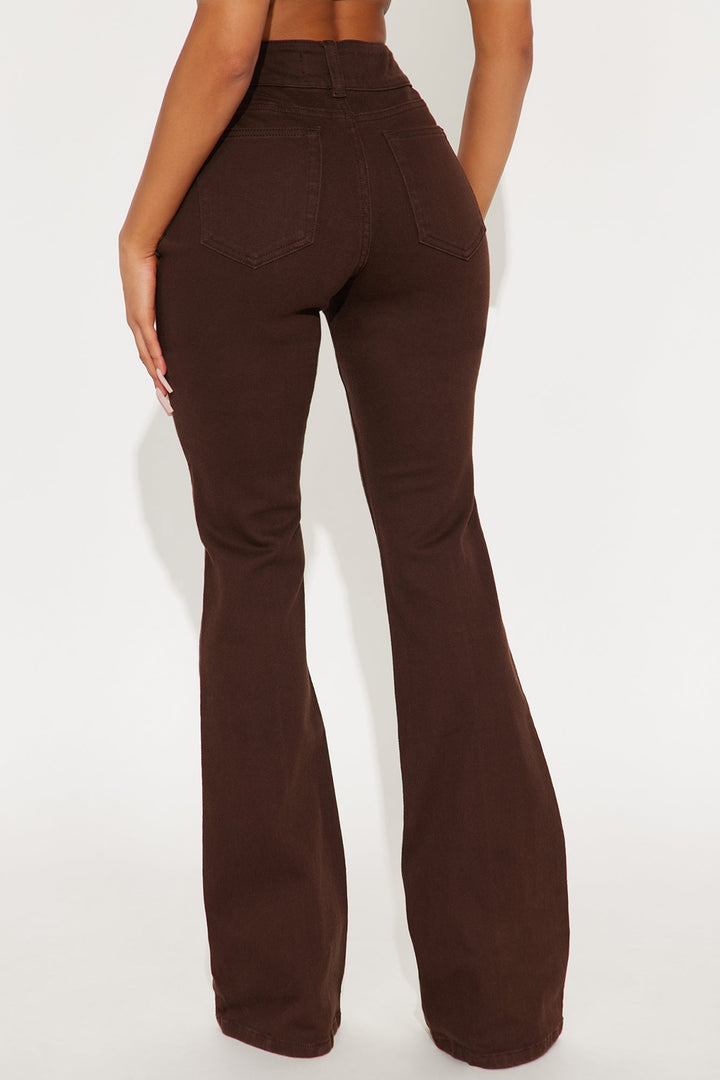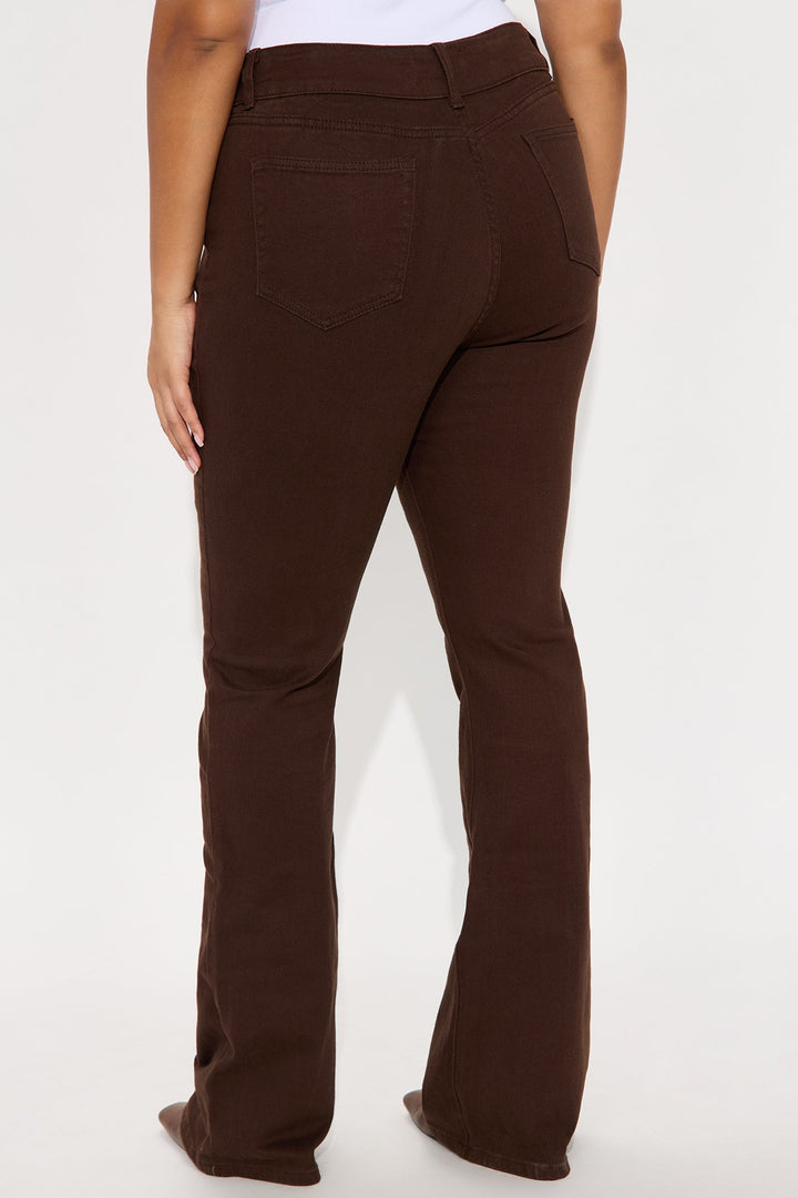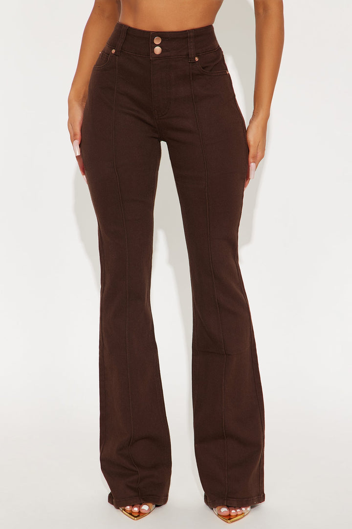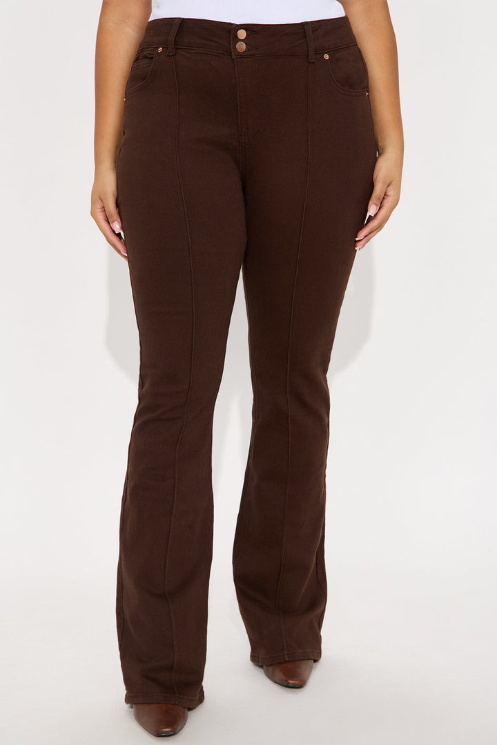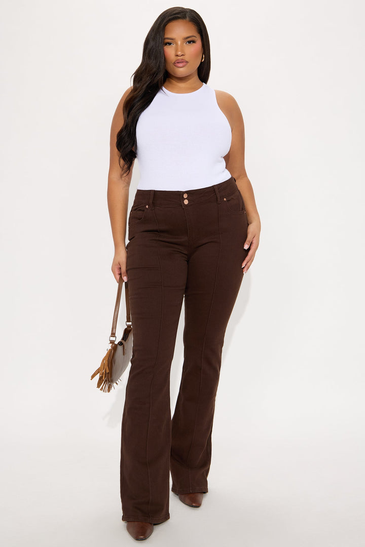 Available In Brown. | Available In Petite 31" Inseam, Regular 34" Inseam & Tall 37" Inseam | Flare Jean | 5 Pocket | Pintuck Detail | Double Button Closure | 10" Low Rise | 37" Inseam | Medium Stretch | Disclaimer Due To The Specialized Wash Process, Each Garment Is Unique. | 98% Cotton 2% Spandex | Imported