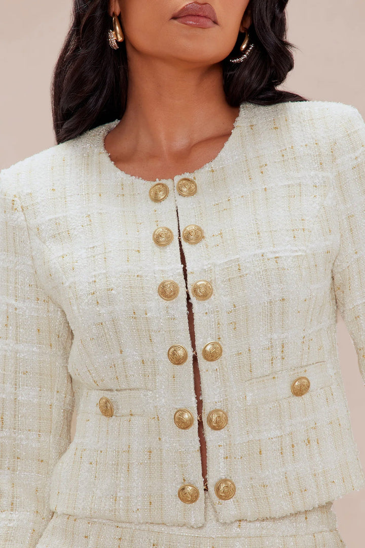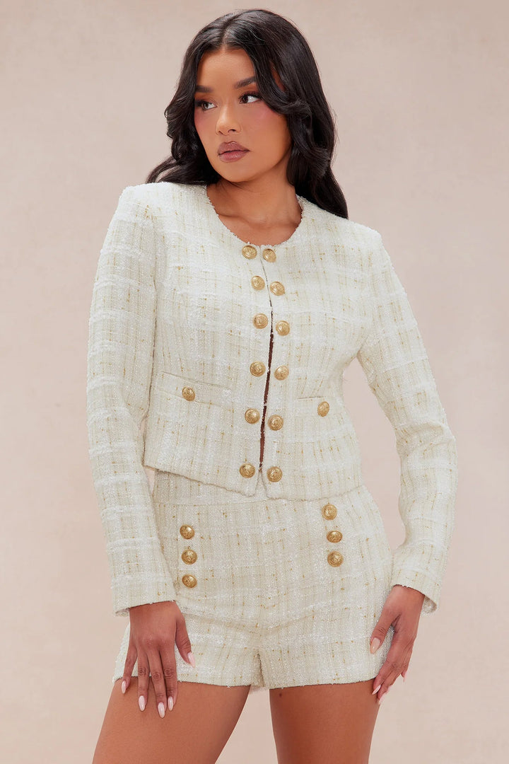 Available In Natural/Combo. | Jacket | Crew Neck | Long Sleeve | Faux Pockets | Front Button Closure | Non Stretch | Main : 85% Polyester , 5% Acetate , 10% Metallic | Lining : 100% Polyester | Imported