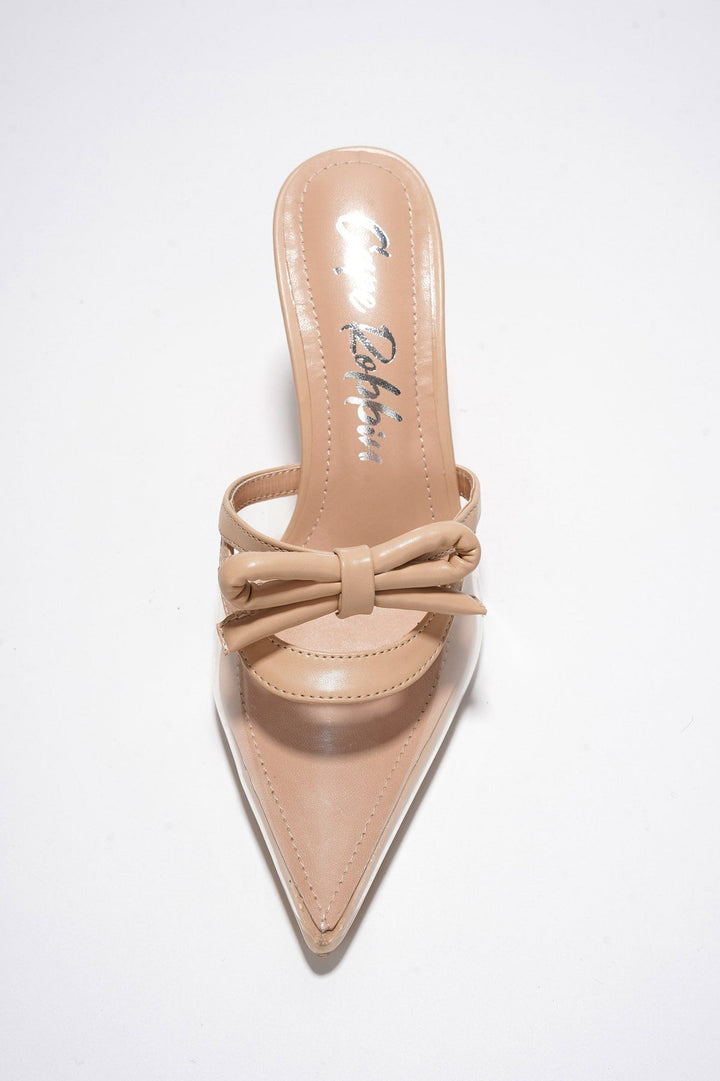 TESSIE - BEIGE - HEELS by CAPE ROBBIN Stiletto Heel: 3 inch Slip on Mule PU leather insole with memory foam cushioning for added comfort Elegant bow detail Pointy toe Available in PVC clear or PU leather black upper Elevate your footwear collection with Tessie elegant pointed toe mules with bow,available in beige and black. Featuring a chic bow accent and a sleek stiletto heel,these mules blend fashion elegance and style. Perfect for both casual and formal occasions. Pair them with dresses or tailored pants for a versatile addition to your wardrobe.
