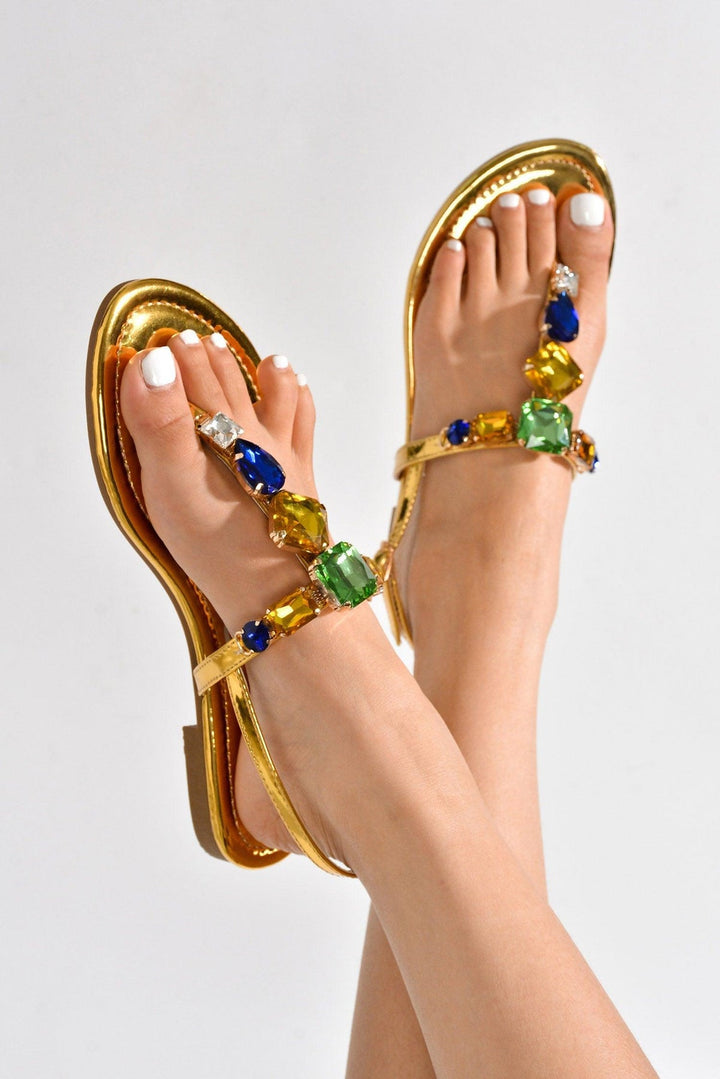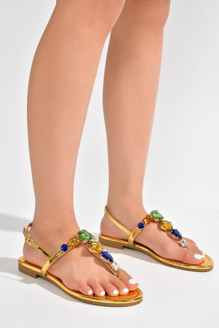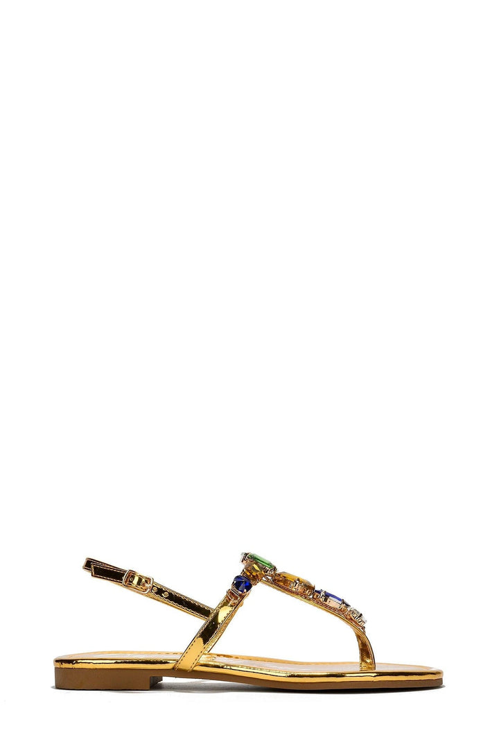 TIKITA - GOLD - SANDALS by CAPE ROBBIN round tow flat sandals gem embellishment buckle slingback For a dazzling day out,Tikita flat sandals are the way to go! Put on a show and shine bright as you strut down the boardwalk.