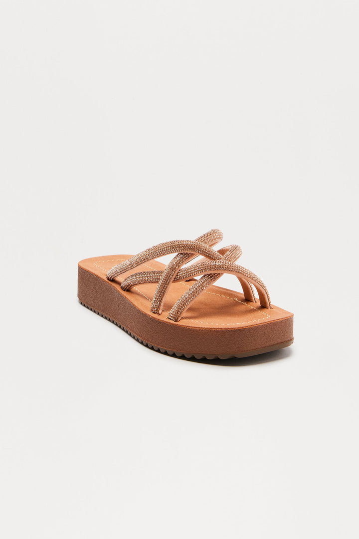 Available In Rose Gold. | Flat Sandals | Rhinestone Trim | Round Toe | 1" Low Platform | Imported