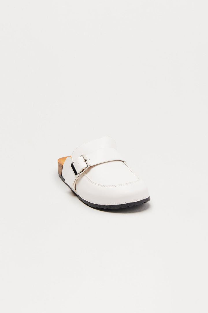 Available In White. | Casual Slides | Buckle Detail | Round Toe | Flat Heel | Imported