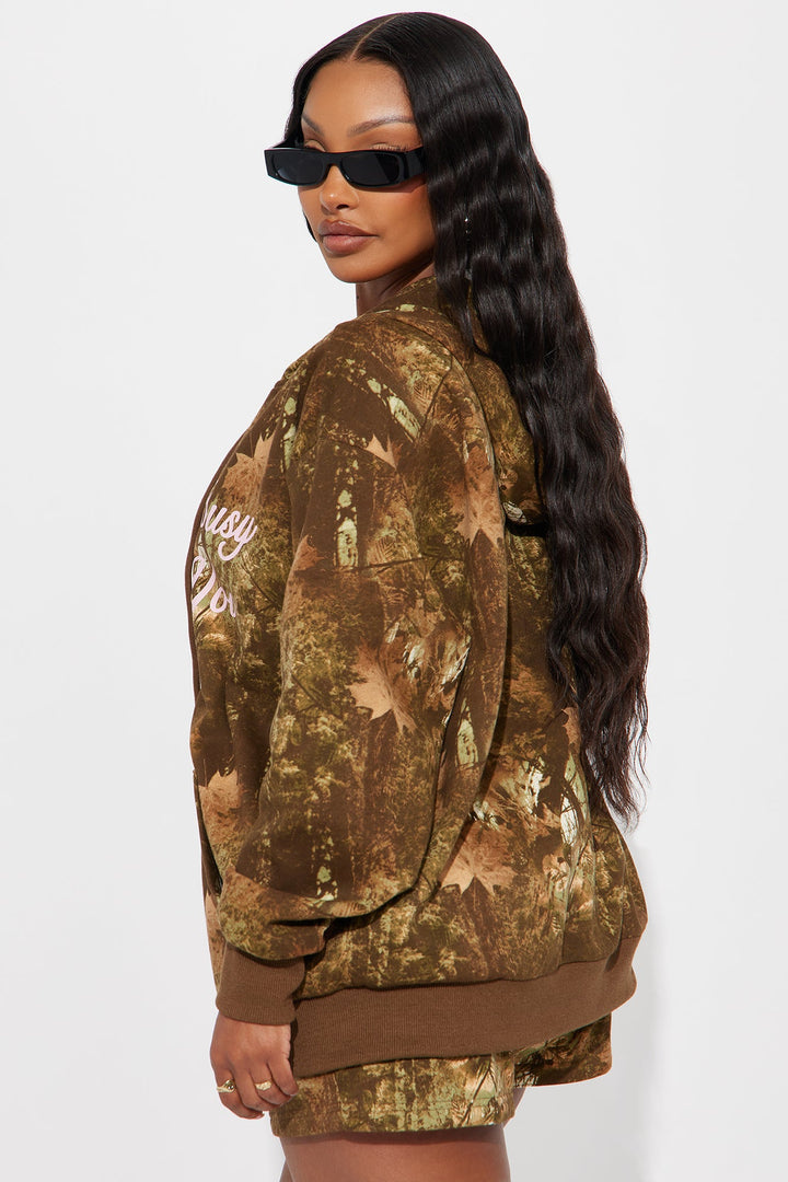 Available In Camouflage. | Zip Up Hoodie | Long Sleeve | Front Screen | Stretch | Pair To "Too Busy For You Camo Mini Shorts" | Disclaimer : Design Pattern Placement Will Vary | 50% Cotton 50% Polyester | Imported