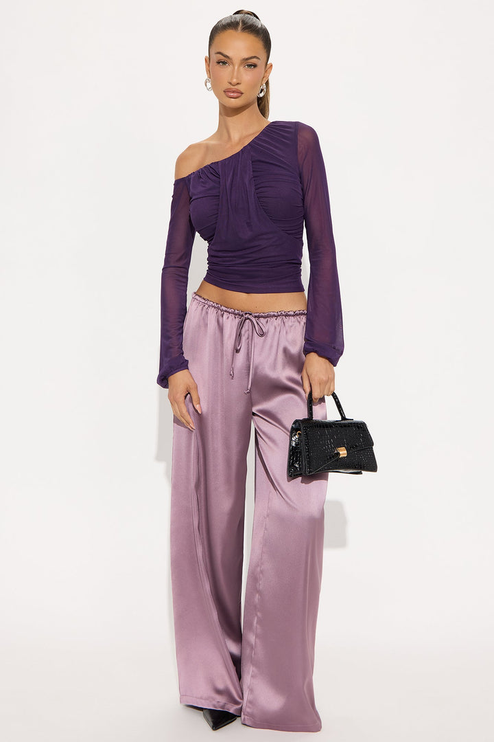 Available In Eggplant. | Mesh Top | Off Shoulder | Long Sleeve | Ruched | Stretch | Self- 95% Polyester 5% Spandex | Lining- 100% Polyester | Imported
