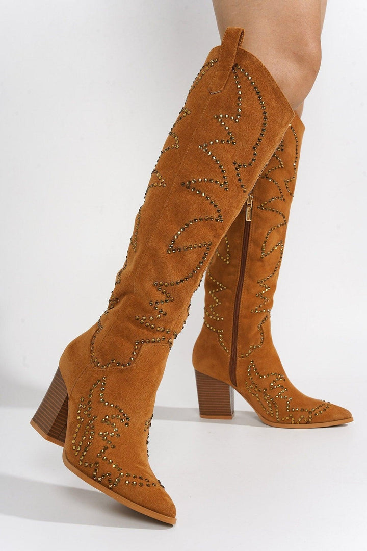 TRIPOLI - TAN - BOOTS by CAPE ROBBIN pointy toe ~3 inch block heel Western-inspired true to size pull tab memory foam footbed Wild,wild West with a modern twist! Tripoli cowgirl boots reel in attention with their knee-high silhouette,premium suede material,and shiny rhinestones.