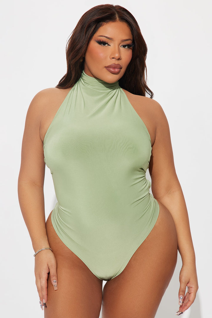 Available In Black, Ivory, Orange And Sage. | Mock Neck Bodysuit | Stretch | Halter | Button Neck Closure | Backless | Adjustable Back Straps | Cheeky Bottom | Snap Closure | Final Sale | 95% Polyester 5% Spandex | Imported