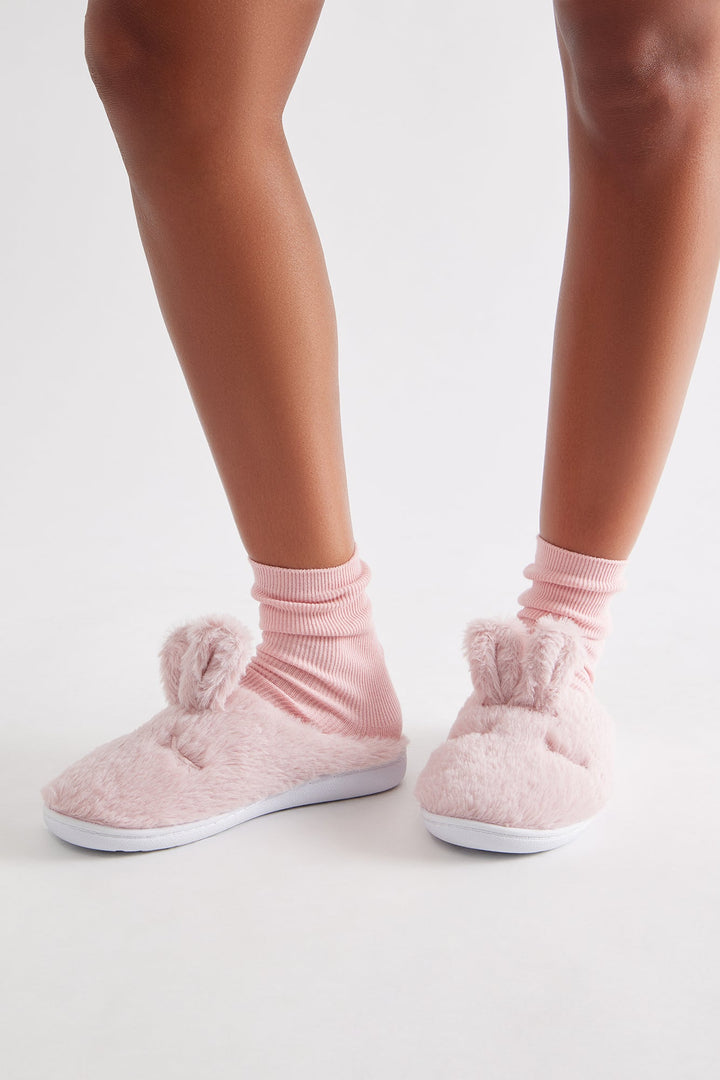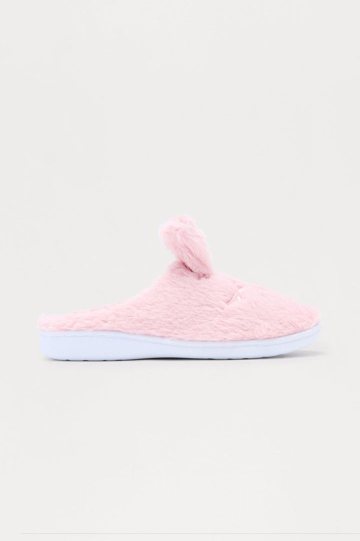 Available In Black, Pink And White. | Close Toe Slippers | Faux Fur | Bunny Ears 3D Applique | Round Toe | Flat Heel | Imported