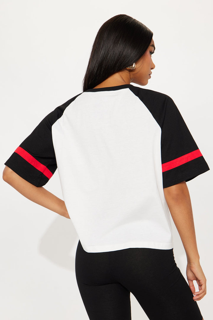 Available In White. | TShirt | Raglan | Crew Neck | Short Sleeve | Disclaimer: Due To The Printing Process A Difference In Saturation May Occur. Each Garment Is Unique. | 60% Polyester 40% Cotton | Imported