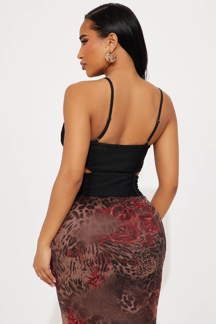 Available In Black. | Bandage Corset Top | Stretch | Adjustable Straps | Cut Out | Ruched | Self: 90% Polyester 10% Spandex | Contrast: 95% Polyester 5% Spandex | Imported
