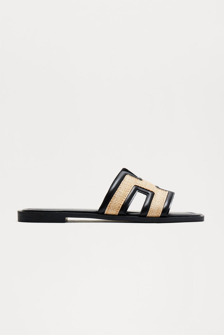 Available In Black And Tan. | Flat Sandals | Raffia Strap | Square Toe | Flat Heel | Imported