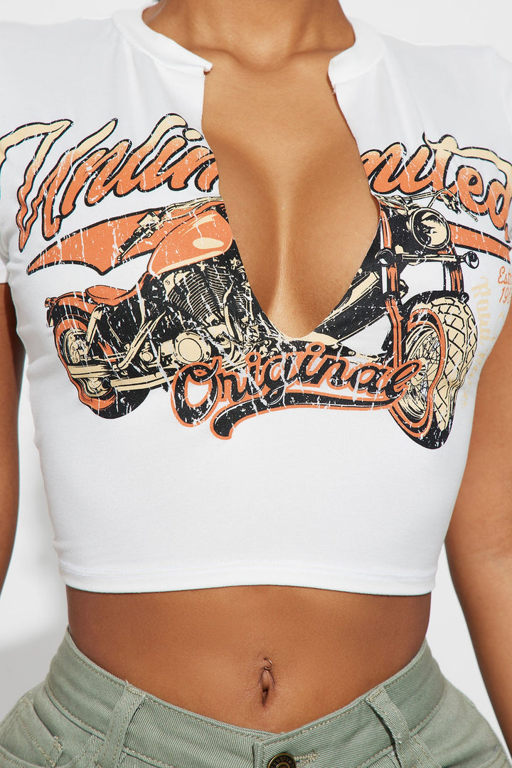 Available In Ivory. | Baby Tee | Deep V Neck | Short Sleeve | Graphic Detail | Stretch | Disclaimer: Due To The Printing Process A Difference In Saturation May Occur. Each Garment Is Unique. Print Placement Will Vary. | 95% Polyester 5% Spandex | Imported