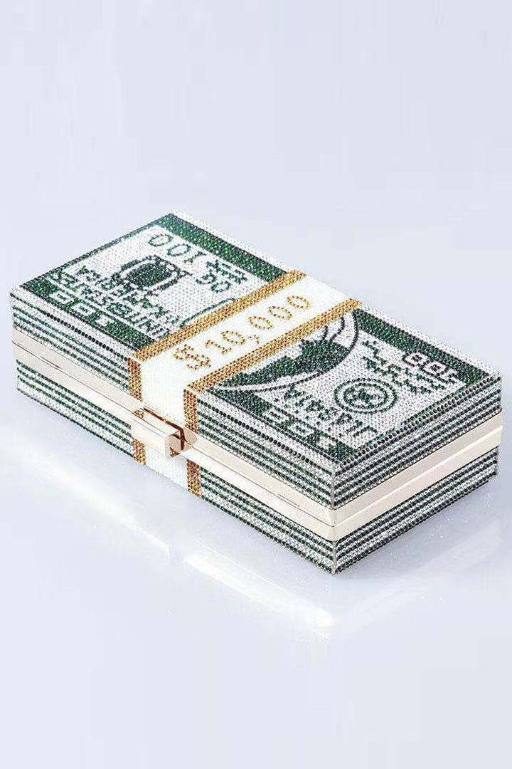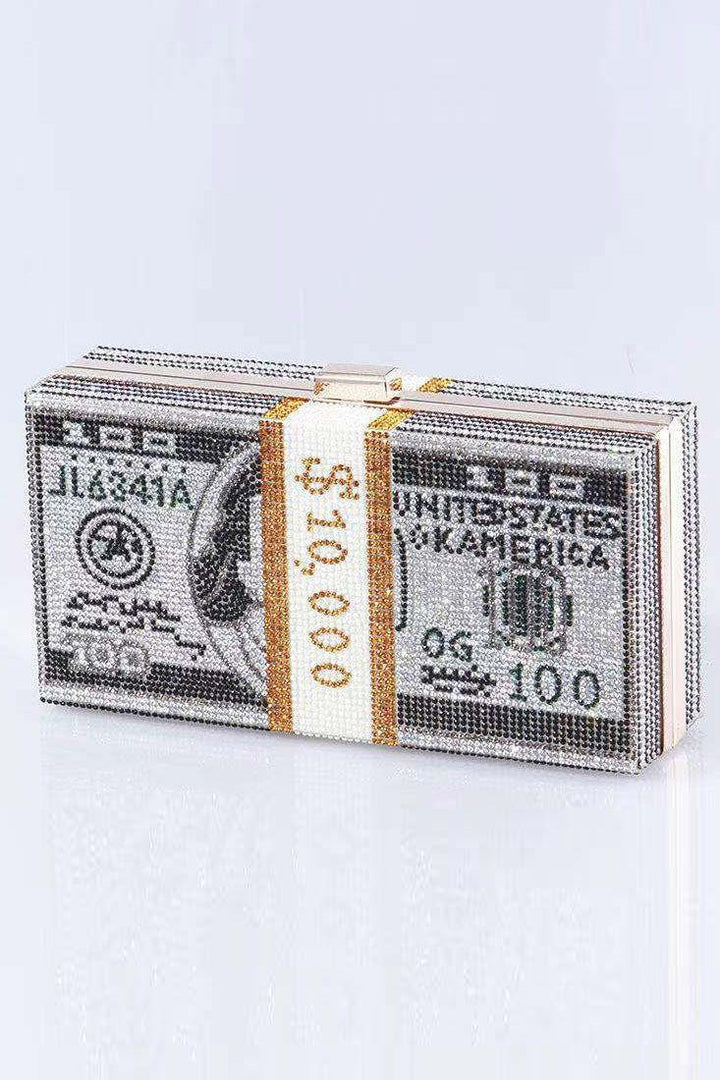 This cute hand bag will look great with any outfit! Featuring; rhinestone, us dollar print, high polish chain, snap button.