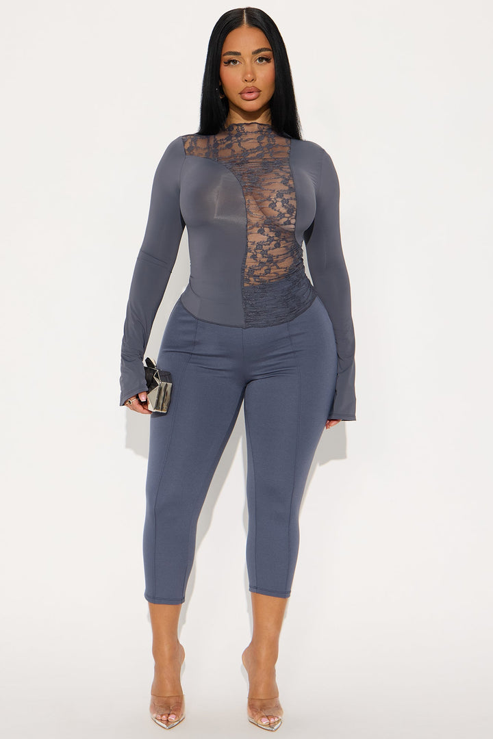 Available In Charcoal. | Top | High Neck | Long Sleeve | Lace | Ruched | Stretch | Self : 80% Nylon 20% Spandex | Contrast : 90% Nylon 10% Spandex | Imported