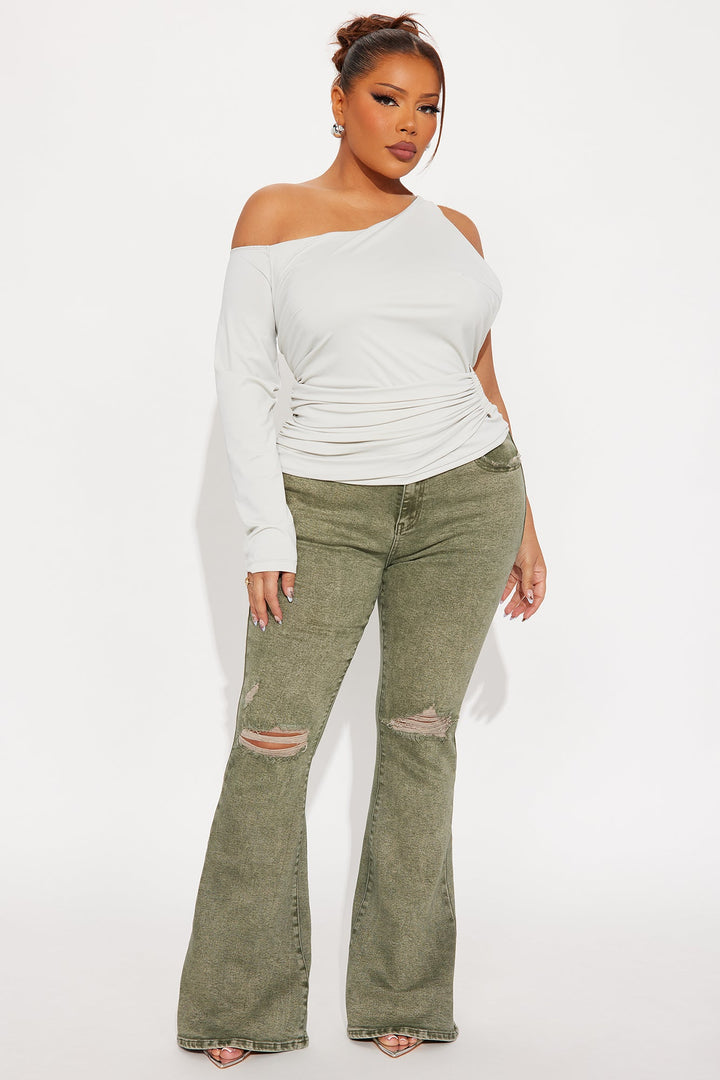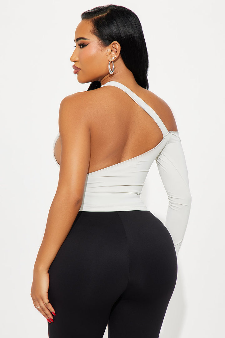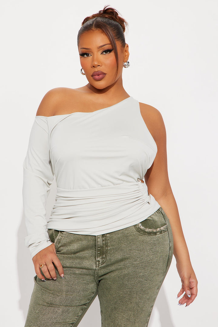 Available In Grey. | Top | Off Shoulder | Long Sleeve | Cut Out | Hardware | Ruched | Stretch | Self: 86% Nylon 14% Spandex | Lining: 86% Nylon 14% Spandex | Imported
