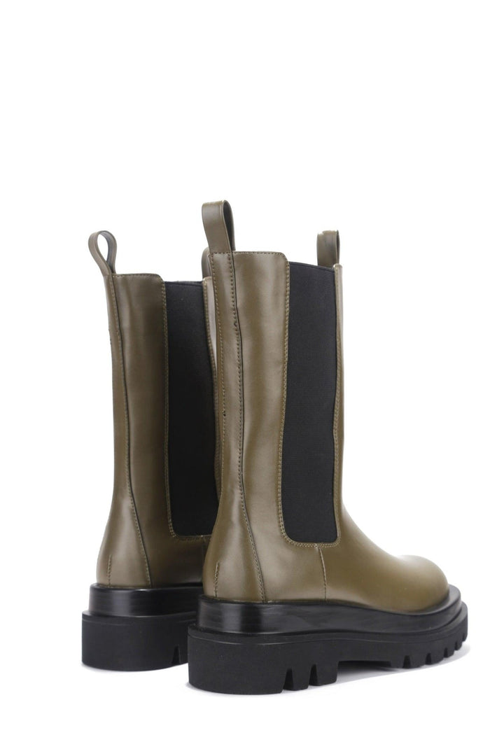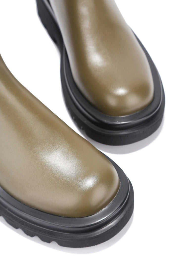 VEGAS - OLIVE - BOOTIES by CAPE ROBBIN round toe chunky lug sole platform booties elastic side panel loop tabs These sultry platform booties will hug your legs in all the right places. With elastic side panels and loop tabs,you'll feel comfortable and sexy all day long. With a thick sole and elevated platform,you'll be strutting your stuff in style.