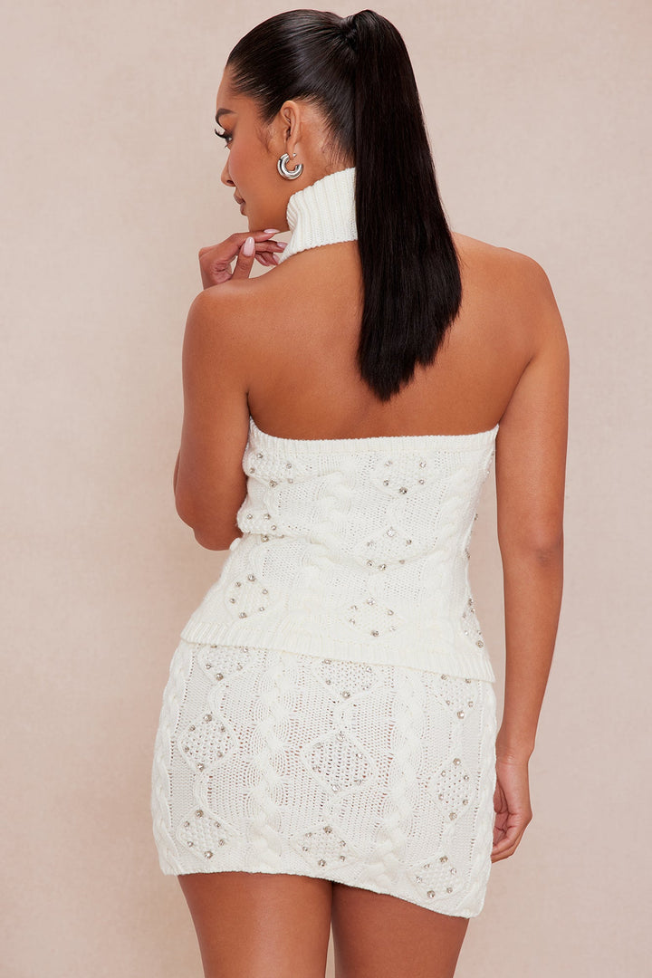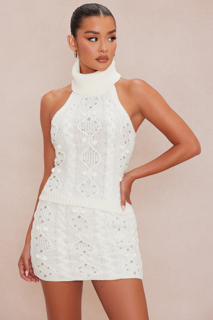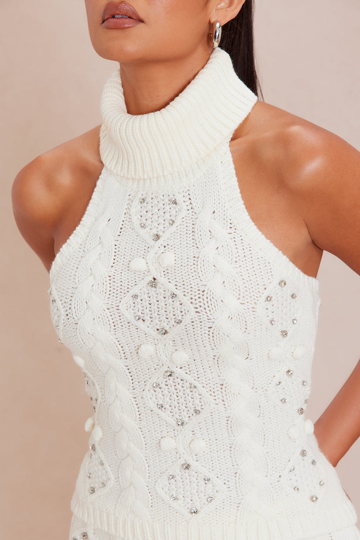 Available In Heather And Ivory. | Embellished | Halter Neck | Stretch | Shell: 85% Acrylic 15% Wool | Imported