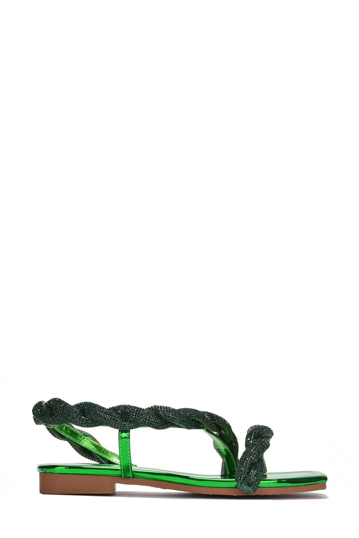 VERTRIA - GREEN - SANDALS by CAPE ROBBIN square toe flat sandals semi-shiny finish rhinestone embellished upper metallic PU wide foot friendly These Vertria sandals offer the perfect combination of style and comfort. The semi-shiny finish reflects the light with each step,while the rhinestone embellished upper dazzles in the sun. Available in black,orange,pink,green,and blue.