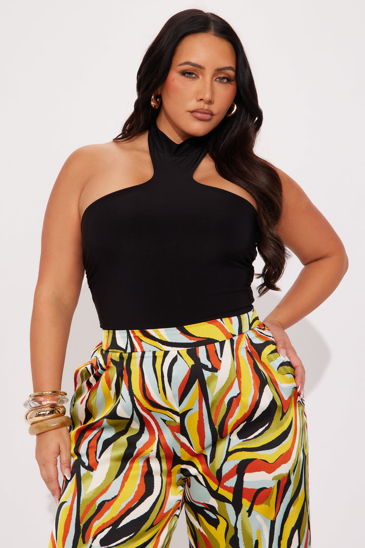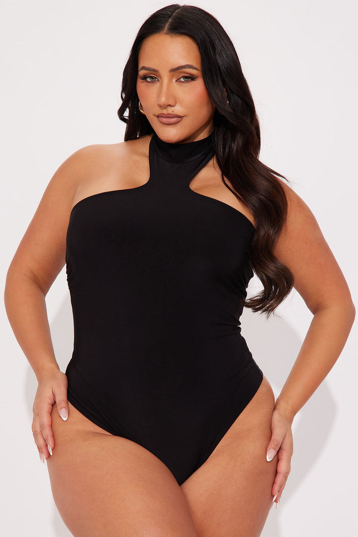 Available In Black, Off White And Taupe. | Bodysuit | Stretch | Y-Neck Halter | Button Neck Closure | Thong Bottom | Snap Closure | Final Sale | 95% Polyester 5% Spandex | Imported