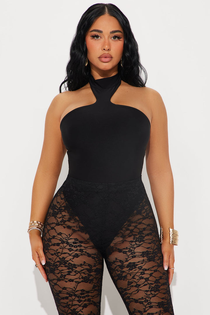 Available In Black, Off White And Taupe. | Bodysuit | Stretch | Y-Neck Halter | Button Neck Closure | Thong Bottom | Snap Closure | Final Sale | 95% Polyester 5% Spandex | Imported