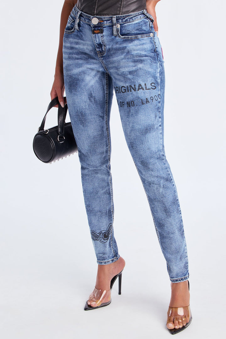 Available In Medium Wash. | Skinny Jean | 5 Pocket | Heritage Beltloops | Screen Print | 8.5" Low Rise | 29" Inseam | Medium Stretch | Disclaimer: Due To The Specialized Wash & Printing Process A Difference In Saturation May Occur. Each Garment Is Unique. | 73% Cotton 24% Polyester 2% Rayon 1% Spandex | Imported