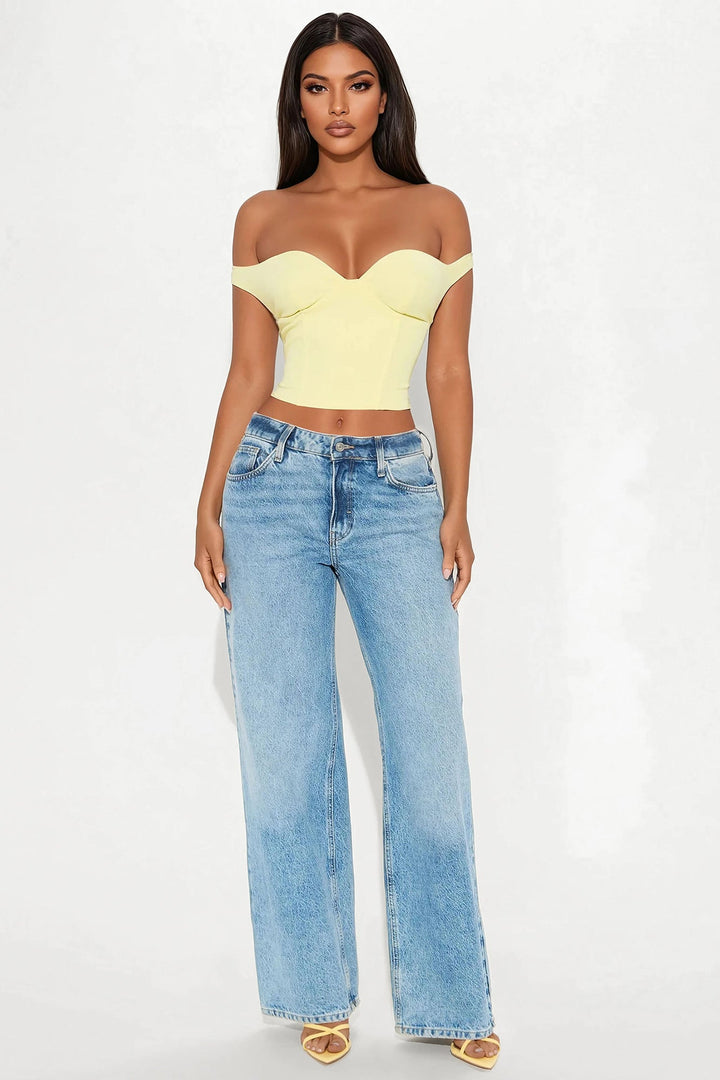 Available In Black And Butter Yellow. | Off Shoulder Top | Stretch | Seaming | Back Zipper | Cropped | Self: 95% Polyester 5% Spandex | Lining: 100% Polyester | Imported