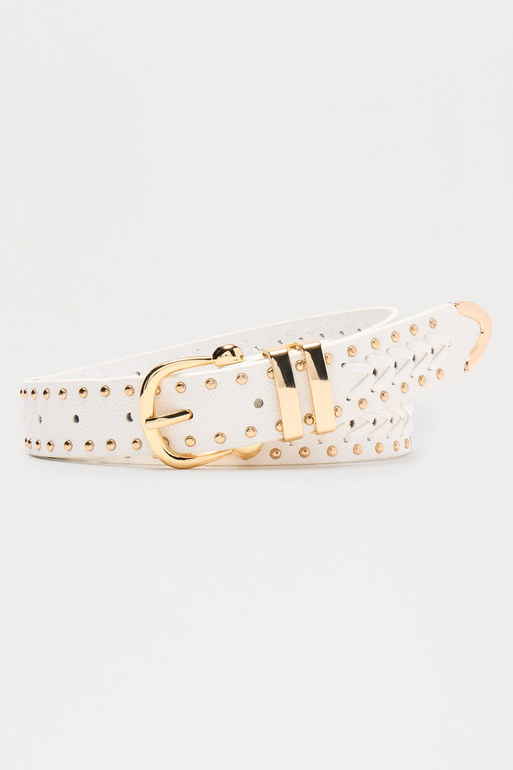 Available In White/Gold. | Faux Leather Material | Braided Detail | Hardware Detail | Length: 40" | Imported