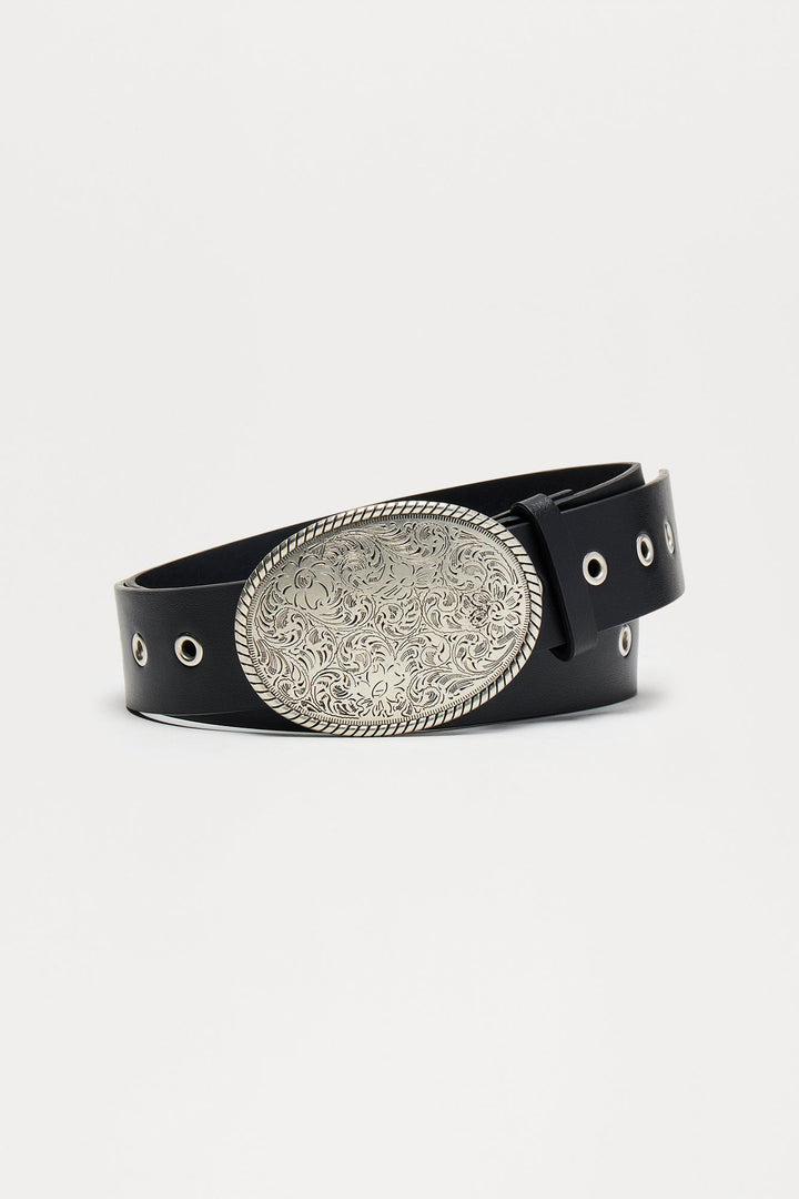 Available In Black. | Standard Belt | Concha Buckle Detail | Hardware Detail | Faux Leather Material | Length: 40" | Imported