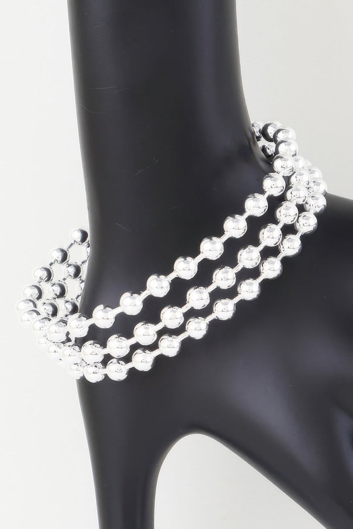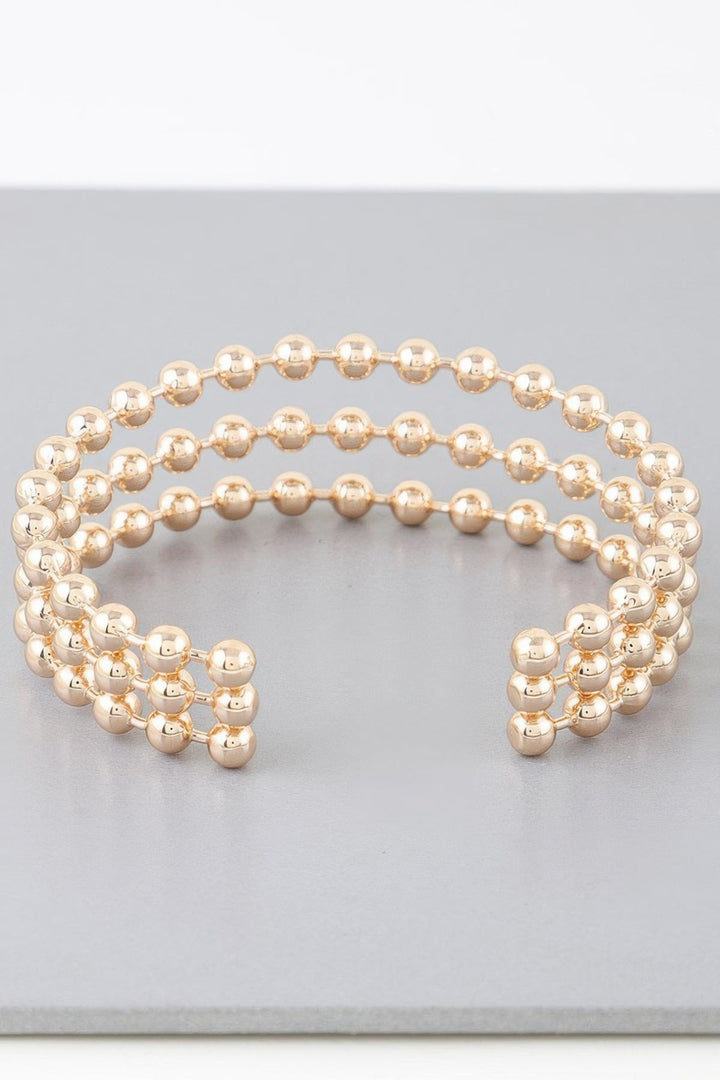 Make a bold statement with our Wide Triple Beaded Cuff Bracelet, a striking piece that adds a touch of elegance and sophistication to any outfit. Designed with three rows of beads, this cuff bracelet combines modern style with timeless appeal, making it a perfect addition to your accessory collection. Key Features: Fabric: Crafted from high-quality metal with a polished gold or silver finish, giving it a luxurious and reflective shine. Fit: Adjustable cuff design that comfortably fits most wrist sizes, offering a custom, secure fit. Color Options: Available in elegant gold and sleek silver, providing versatile options to complement any outfit. Size: Approximately 2.4 x 2.4 inches, designed to make a statement while maintaining a comfortable wear. Design: Features three rows of evenly spaced beads, creating a textured, layered look that adds depth and dimension to the bracelet. Versatile Styling: This cuff bracelet is perfect for both casual and formal occasions. Wear it alone for a minimalist look or stack with other bracelets for added flair. Product Details: Comfortable All-Day Wear: The Wide Triple Beaded Cuff Bracelet is designed for comfort, making it ideal for both everyday wear and special occasions. Quality Craftsmanship: Each piece is carefully crafted and inspected to ensure durability, making it a timeless addition to your jewelry collection. Why Choose Wide Triple Beaded Cuff Bracelet With its bold design and sleek finish, this bracelet is an eye-catching piece that complements both casual and evening looks. The adjustable cuff ensures a comfortable fit, while the bead detailing offers a unique texture, adding style and personality to your wrist. Ideal Occasions: Perfect for evening events, dinner parties, or a stylish addition to your everyday wear. Its versatile design works well with a variety of outfits, from chic dresses to casual outfits. Customer Reviews: "I love how bold and elegant this bracelet is. It's the perfect accessory to elevate any outfit." Grace L. "The beaded design is so unique, and the gold finish adds a touch of sophistication. It's become my go-to bracelet!" Sophie R. "Beautiful bracelet, and it fits perfectly! The adjustable cuff makes it so easy to wear." Naomi T. Size Guide: For accurate sizing guidance, please review our size chart available on the website. Shipping and Returns: Fast Shipping: We offer speedy delivery to your doorstep. Hassle-Free Returns: If you're not completely satisfied, our flexible return policy ensures your peace of mind. Add a touch of elegance and bold style to your accessory collection with the Wide Triple Beaded Cuff Bracelet. Order yours today and enjoy the perfect blend of luxury and comfort! Wide Triple Beaded Cuff Bracelet