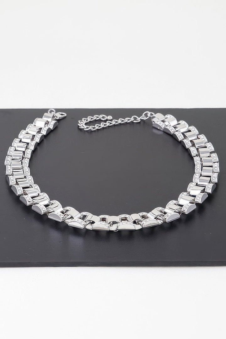 Add a touch of glamour to your jewelry collection with our Jeweled Box Chain Necklace, a stunning piece designed to elevate any look with its sophisticated sparkle. Expertly crafted to combine elegance and charm, this necklace is perfect for adding a refined touch to both everyday outfits and special occasions. Key Features: Fabric: The necklace features a high-quality gold-plated or silver-plated box chain, adorned with sparkling clear gemstones that add a subtle yet dazzling shine. Fit: Measuring approximately 14" in length, this necklace fits comfortably around the neck, offering a chic and graceful look. Color Options: Available in two beautiful combinations-Gold with Clear stones and Silver with Clear stones-each providing a timeless, versatile option for different preferences. Sizes: One size that fits most, with an adjustable chain for a customizable fit. Design: The box chain design is paired with clear gemstones, creating a modern and minimalistic yet glamorous accessory that works for any occasion. Versatile Styling: Whether worn with a simple tee for a touch of elegance or dressed up with evening wear, this necklace is perfect for both casual and formal looks. Product Details: Comfortable All-Day Wear: The lightweight design ensures the Jeweled Box Chain Necklace can be worn comfortably throughout the day or evening. Quality Craftsmanship: Each necklace is crafted with attention to detail, using premium materials for durability and lasting beauty. Why Choose Jeweled Box Chain Necklace This necklace effortlessly combines minimalism with a touch of glamour, making it a versatile addition to any jewelry collection. The sparkling clear gemstones offer just the right amount of shine, making it perfect for daily wear or special occasions. Ideal Occasions: Perfect for adding elegance to your everyday style, dressing up for an evening event, or as a thoughtful gift for someone special. Customer Reviews: The clear stones sparkle so beautifully in the light! I wear this necklace almost every day. A. P. It's the perfect delicate necklace. The gold is stunning and goes with everything. L. G. I bought this as a gift, and the recipient absolutely loved it! It's classy and chic. J. B. Size Guide: For accurate sizing guidance, please review our size chart available on the website. Shipping and Returns: Fast Shipping: We offer speedy delivery to your doorstep. Hassle-Free Returns: If you're not completely satisfied, our flexible return policy ensures your peace of mind. Make a statement with the Jeweled Box Chain Necklace. Add it to your cart now and experience the perfect combination of elegance, glamour, and versatility! Jeweled Box Chain Necklacee