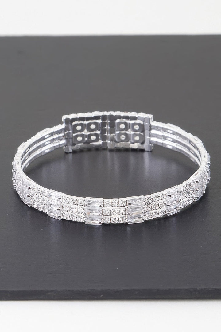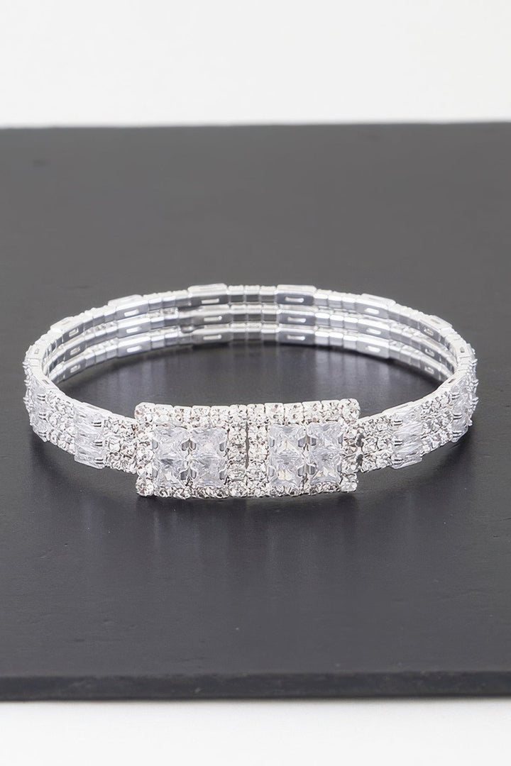 Add a touch of refined glamour to your jewelry collection with our Multi Cubic Zirconia Bracelet, a dazzling piece that brings a modern twist to classic elegance. Expertly designed to catch the light, this bracelet is perfect for those who want a chic, sparkling accessory that complements any outfit. Key Features: Fabric: The bracelet features a high-quality silver-plated band adorned with multiple clear cubic zirconia stones, adding a sophisticated sparkle to your wrist. Fit: Measuring approximately 2.2 x 2.2", this bracelet is designed to fit most wrist sizes comfortably, offering both style and ease of wear. Color Options: Available in a sleek Silver finish with clear cubic zirconia stones, providing a timeless, versatile look. Sizes: One size fits most, with an adjustable design that ensures a perfect and secure fit. Design: The bracelet features a collection of clear cubic zirconia stones arranged in a stunning, multi-stone design, offering a radiant and luxurious appearance. Versatile Styling: Whether worn alone as a statement piece or layered with other bracelets, this accessory is perfect for both casual and formal occasions. Product Details: Comfortable All-Day Wear: The lightweight and adjustable design ensures the Multi Cubic Zirconia Bracelet can be worn comfortably throughout the day or night. Quality Craftsmanship: Made from high-quality materials, this bracelet is designed to maintain its beautiful shine and durability over time. Why Choose Multi Cubic Zirconia Bracelet This bracelet combines the elegance of silver with the sparkle of multiple cubic zirconia stones, creating a stunning piece that elevates any look. Its versatile design makes it perfect for adding a touch of sophistication to any outfit. Ideal Occasions: Perfect for evening events, special celebrations, or as a thoughtful gift for someone who loves classic and elegant accessories. Customer Reviews: The sparkle of the cubic zirconia is just beautiful! It's the perfect bracelet for adding some elegance to any outfit. A. W. I love how delicate yet striking this bracelet is. It's simple but adds just the right amount of glamour! S. M. Bought this as a gift, and it was loved! The quality is fantastic, and it looks gorgeous on. J. K. Size Guide: For accurate sizing guidance, please review our size chart available on the website. Shipping and Returns: Fast Shipping: We offer speedy delivery to your doorstep. Hassle-Free Returns: If you're not completely satisfied, our flexible return policy ensures your peace of mind. Add a touch of luxury to your jewelry collection with the Multi Cubic Zirconia Bracelet. Add it to your cart today and enjoy a beautiful piece that shines with every wear! Multi Cubic Zirconia Bracelet