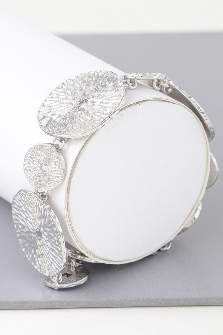 Elevate your jewelry collection with the Multi Hammered Disc Bracelet. With its bold design and hammered texture, this bracelet is a perfect addition to any outfit, offering a touch of modern sophistication. Key Features: Fabric: Metal Fit: Adjustable, designed to comfortably fit most wrist sizes Color Options: Gold, Silver Sizes: 2.4 x 2.4" Approx Design: Featuring multiple hammered discs, this bracelet adds texture and depth, creating a unique and eye-catching look Versatile Styling: Perfect for casual outings, evening events, or adding a statement piece to office wear Product Details: Comfortable All-Day Wear: Lightweight and designed for comfort, this bracelet can be worn from morning to night without discomfort. Quality Craftsmanship: Made from high-quality metal, this bracelet retains its shine and hammered texture over time, ensuring lasting beauty. Why Choose Multi Hammered Disc Bracelet This bracelet combines a modern design with timeless elegance. Its unique hammered disc pattern makes it a standout piece, while its versatile color options make it easy to incorporate into any outfit. Ideal Occasions: Perfect for casual, office, or evening wear, adding sophistication and texture to your look. Customer Reviews: I love the hammered texture! It's so stylish and goes with just about everything. H. James A beautiful bracelet that stands out without being too bold. It's my new favorite piece! J. Carter Perfect for dressing up or down. The hammered discs give it such an interesting look. L. Davis Size Guide: For accurate sizing guidance, please review our size chart available on the website. Shipping and Returns: Fast Shipping: We offer speedy delivery to your doorstep. Hassle-Free Returns: If you're not completely satisfied, our flexible return policy ensures your peace of mind. Add the Multi Hammered Disc Bracelet to your collection today and enjoy a chic, versatile accessory that complements any outfit! Multi Hammered Disc Bracelet