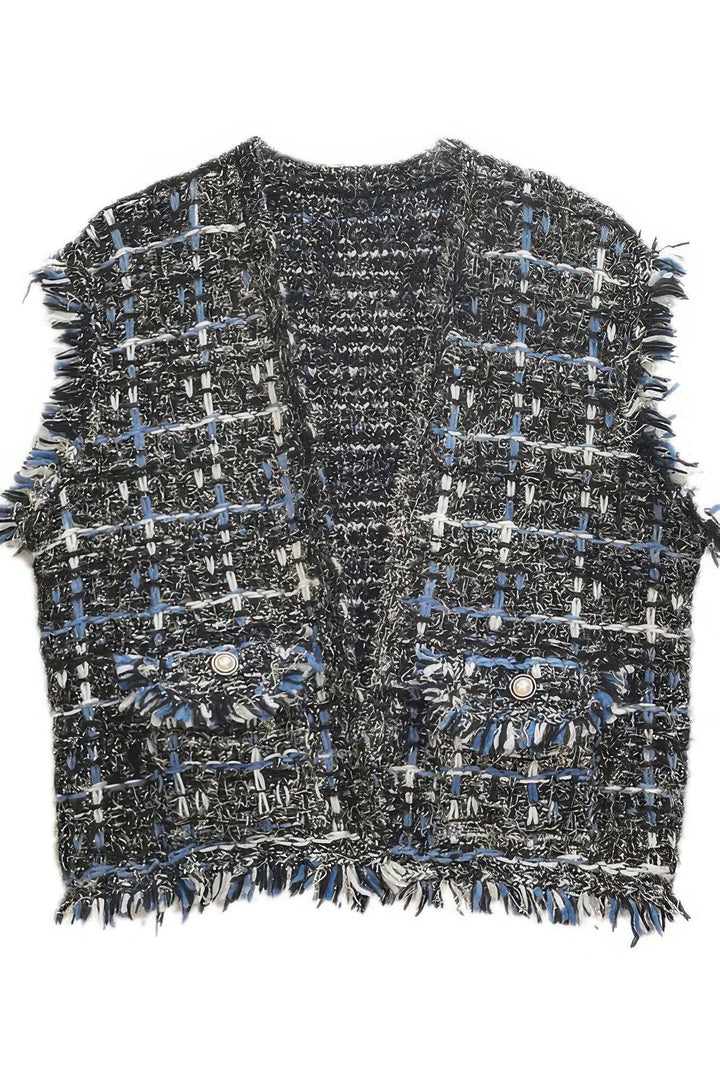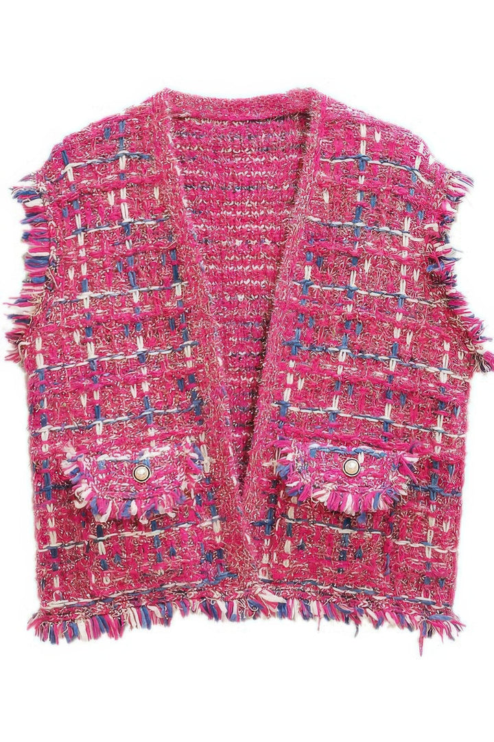 Elevate your wardrobe with our Plaid Tweed Vest, a perfect blend of sophistication and contemporary style. This statement piece is crafted from high-quality tweed fabric, featuring a classic plaid pattern interwoven with subtle metallic threads for a touch of elegance. Designed with a tailored, sleeveless silhouette, this vest offers a structured yet relaxed fit, making it an effortless layering essential. The vest is adorned with frayed raw edges , giving it a modern, fashion-forward appeal, while the front flap pockets with decorative buttons add a functional yet stylish touch. The open-front design allows for easy layering over your favorite turtlenecks, blouses, or knitwear, making it versatile for both casual and dressy occasions. Whether paired with a sleek leather skirt for an edgy look or worn over a fitted dress for a polished ensemble, this Plaid Tweed Vest is a must-have for any fashion-conscious wardrobe. Key Features: Classic plaid tweed fabric with a textured finish Frayed raw edges for a chic, modern touch Front flap pockets with button accents Sleeveless, open-front design for effortless layering Versatile styling perfect for casual or dressy occasions Fabric Content: 100% Polyester Fit & Sizing: Relaxed fit Care Instructions: Dry clean recommended Plaid Tweed Vest