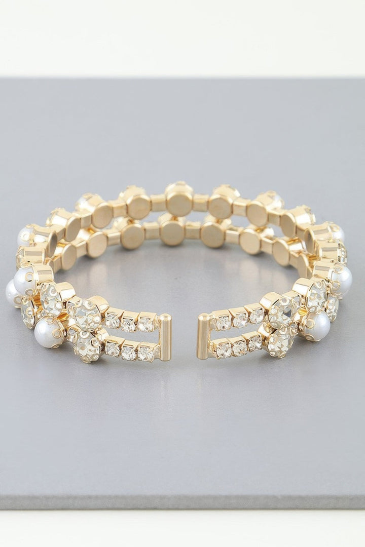 Add a touch of timeless elegance to your collection with our Double Pearled Cuff Bracelet. This stunning piece combines the classic appeal of pearls with a modern cuff design, offering a sophisticated accessory that seamlessly complements any outfit. Key Features: Fabric: [High-quality metal with pearl detailing] Fit: 2.2 x 2.2" Approx Color Options: Gold Clear, Silver Clear Design: The bracelet features two luminous pearls set on a sleek cuff, creating a balance of elegance and modern style. The open cuff design ensures a comfortable and adjustable fit, making it perfect for all wrist sizes. Versatile Styling: Whether you're dressing up for a formal event or adding a polished touch to your everyday look, this bracelet offers the perfect combination of sophistication and style. Product Details: Comfortable All-Day Wear: Lightweight and easy to wear, the Double Pearled Cuff Bracelet provides comfort throughout the day or evening, making it ideal for long hours of wear. Quality Craftsmanship: Carefully crafted with attention to detail, each bracelet ensures the pearls stay securely in place while maintaining its flawless finish. Why Choose Double Pearled Cuff Bracelet This bracelet offers a refined and timeless design, making it the perfect accessory for those who appreciate classic elegance with a contemporary twist. The combination of pearls and cuff design provides a luxurious yet understated look. Ideal Occasions: Perfect for formal events, casual outings, or adding a chic touch to office wear, this bracelet can be worn for a variety of occasions, making it a versatile and essential accessory. Customer Reviews: "Such a beautiful bracelet! The pearls add the perfect touch of elegance to my outfit." - Sophia R. "I love how It's both modern and classic at the same time. It's a must-have piece!" - Daniel P. "So chic and comfortable! It goes with everything, and I get compliments every time I wear it." - Chloe L. Size Guide: For accurate sizing guidance, please review our size chart available on the website. Shipping and Returns: Fast Shipping: We offer speedy delivery to your doorstep. Hassle-Free Returns: If you're not completely satisfied, our flexible return policy ensures your peace of mind. Add the Double Pearled Cuff Bracelet to your collection today and enjoy the perfect balance of elegance, comfort, and timeless style! Double Pearled Cuff Bracelet