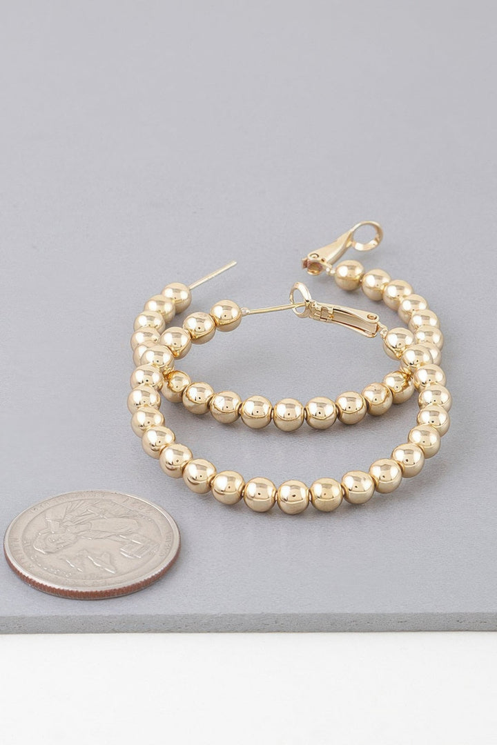 Shiny Beaded Hoop Earrings Add a touch of brilliance to your accessory collection with our Shiny Beaded Hoop Earrings. Designed to catch the light and turn heads, these radiant hoops feature a shimmering beaded texture that blends timeless elegance with modern flair. Key Features: Material: Polished metal beads with a lustrous finish Fit: Approx. 1.6" x 1.6" a classic size for effortless everyday elegance Design: These hoops feature a symmetrical circular design adorned with sleek, shiny beads that reflect light with every movement. The minimalist yet eye-catching look makes them an ideal statement piece. Versatile Styling: Whether paired with a casual tee or a cocktail dress, these hoops add instant polish and charm to any ensemble. Product Details: Lightweight Comfort: Designed to be featherlight so you can wear them all day without discomfort. Lasting Shine: Made with quality materials that maintain their radiant finish wear after wear. Why Choose Shiny Beaded Hoop Earrings These hoops offer a chic and modern twist on a classic favorite. Their beaded design brings texture and sparkle, making them the perfect go-to earrings for any season or style. Ideal Occasions: Perfect for everyday wear, date nights, office outfits, or when you want to add a little shimmer to your look. Customer Reviews: Simple, classy, and shiny-everything I want in a hoop earring! Rachel F. They're the perfect size and go with literally everything. Jenna K. Love the beaded texture-it gives them that extra sparkle! Dana L. Size Guide: For detailed sizing and styling suggestions, please check our size chart on the website. Shipping and Returns: Fast Shipping: Enjoy quick and reliable delivery. Hassle-Free Returns: Your satisfaction matters—our return policy makes it easy. Shine with confidence and add a sleek statement to your look with the Shiny Beaded Hoop Earrings. Order yours today and embrace effortless elegance! Shiny Beaded Hoop Earrings