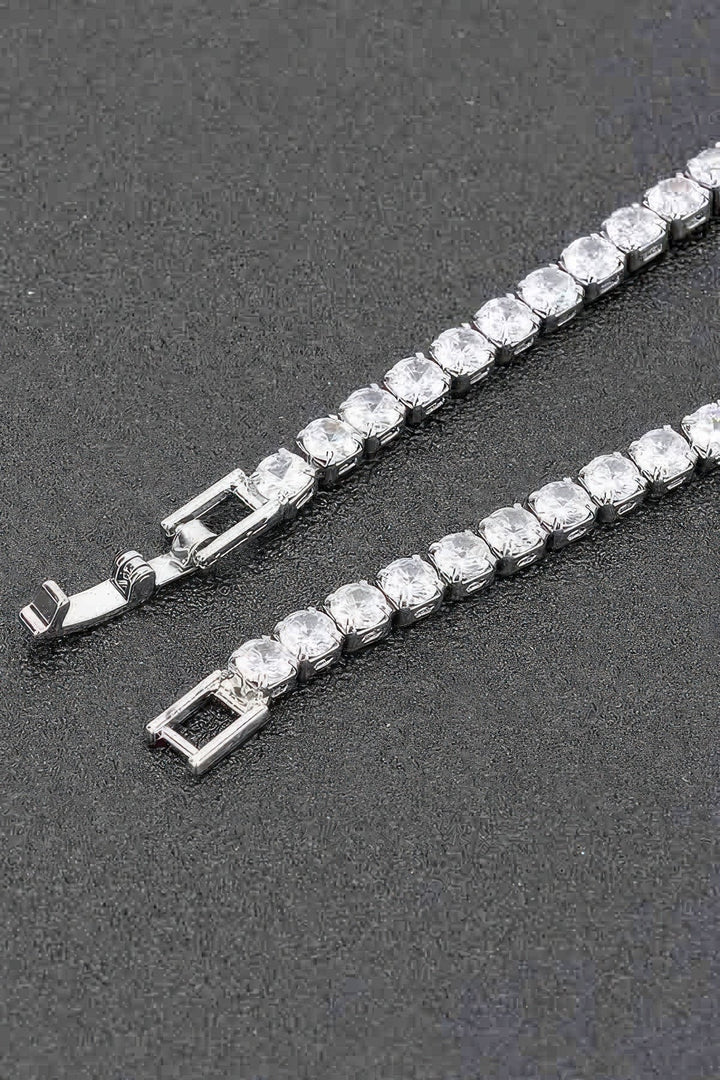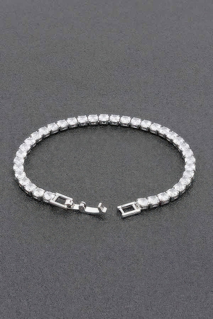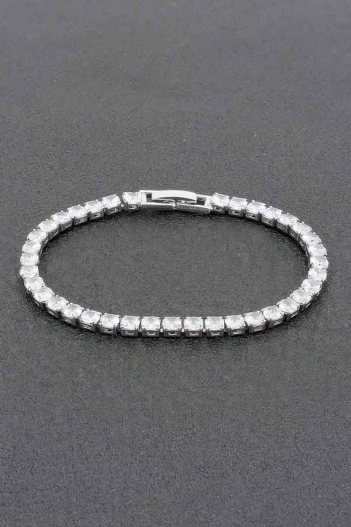 Product Description: Sleek and refined, the Cubic Zirconia Bracelet brings a touch of brilliance to your everyday style. Featuring a continuous line of radiant cubic zirconia, this bracelet is crafted to catch the light with every movement. Its slender silhouette and polished finish offer a modern take on classic elegance, making it perfect for both special occasions and daily wear. Designed for comfort and versatility, it layers beautifully or stands out on its own. A timeless piece that adds instant sophistication to any jewelry collection. Product Details: Adorned with a full row of sparkling cubic zirconia Slim, minimalist design for effortless elegance Polished metal setting enhances shine Approximate dimensions: 0.15" x 6.5" Lightweight and easy to wear solo or stacked Secure clasp ensures a comfortable fit Size Guide: For accurate sizing guidance, please review our size chart available on the website. Shipping and Returns: Fast Shipping: We offer speedy delivery to your doorstep. Hassle-Free Returns: If you're not completely satisfied, our flexible return policy ensures your peace of mind. Cubic Zirconia Bracelet