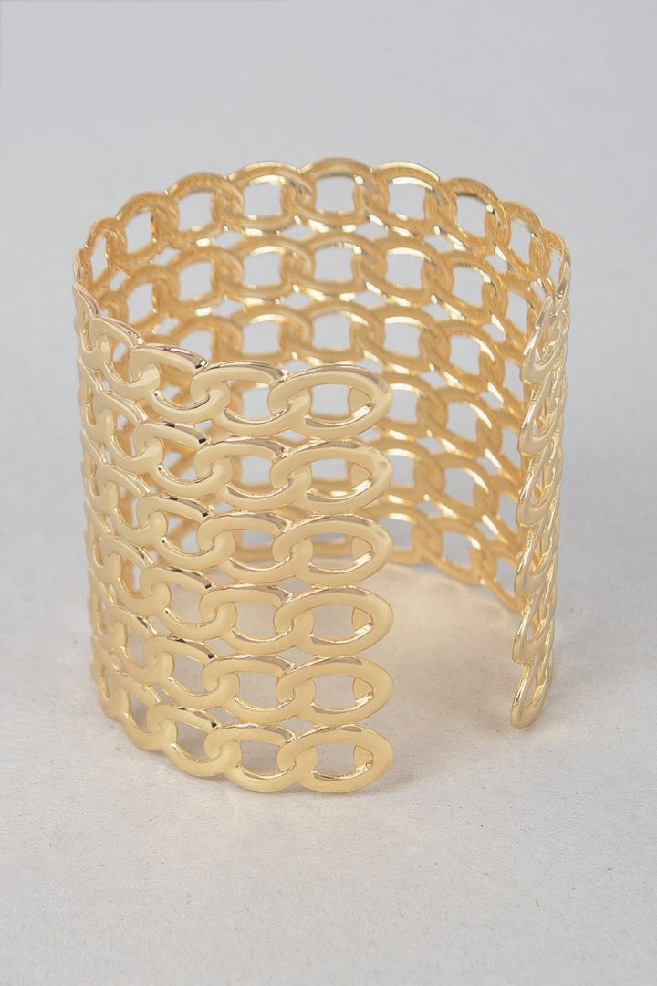Product Description: Bold and beautifully crafted, the Wide Chain Metal Cuff Bracelet offers a sleek, modern take on statement jewelry. Designed with a wide, chain-like structure from a single piece of polished metal, this cuff delivers a striking look with enduring appeal. Its open-back design allows for easy wear while maintaining a secure and comfortable fit. Perfect for dressing up or adding edge to everyday outfits, this bracelet exudes confidence and contemporary style. A standout piece that effortlessly elevates any accessory lineup. Product Details: Wide chain-inspired cuff made from a single piece of metal Polished finish adds a clean, modern look Open-back design for easy on and off Approximate dimensions: 2.25" x 2.25" x 2.5" Structured yet lightweight for comfortable wear Ideal for both everyday styling and special occasions Size Guide: For accurate sizing guidance, please review our size chart available on the website. Shipping and Returns: Fast Shipping: We offer speedy delivery to your doorstep. Hassle-Free Returns: If you're not completely satisfied, our flexible return policy ensures your peace of mind. Wide Chain Metal Cuff Bracelet