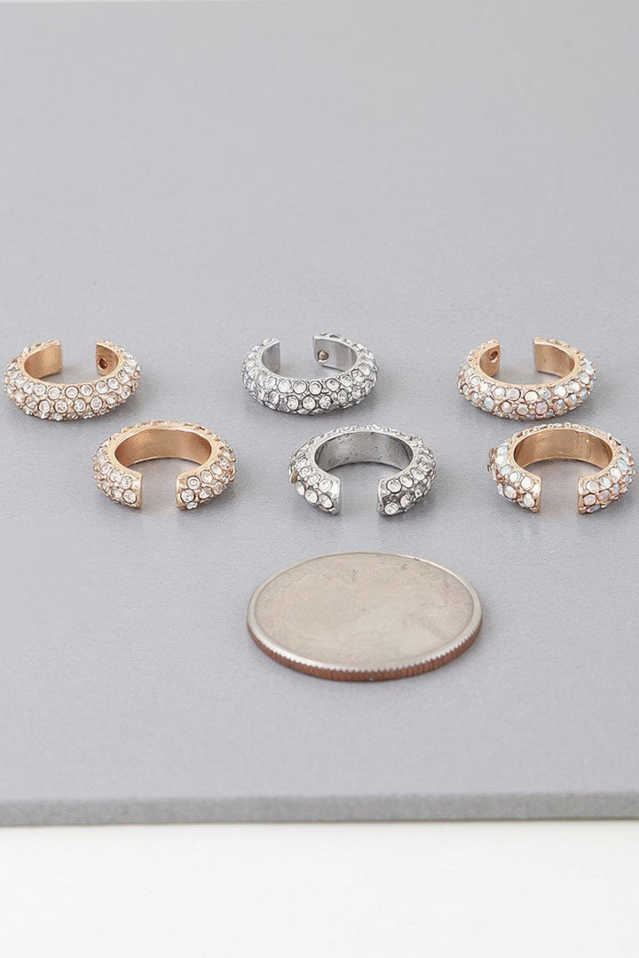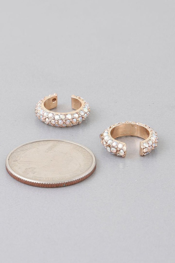 Product Description: Make a bold yet elegant statement with the Bejeweled Ear Cuff Earrings, designed to bring a modern twist to classic sparkle. Featuring a compact 0.5 by 0.5-inch design, these ear cuffs are encrusted with shimmering rhinestones that catch the light with every movement. Their sleek, curved silhouette hugs the ear comfortably, offering a contemporary edge without the need for multiple piercings. Ideal for elevating both casual and dressy looks, they deliver high-impact shine in a minimalist size. These earrings are a standout choice for those who love refined glamour with a touch of individuality. Product Details: Approx. 0.5" x 0.5" in size Features a curved cuff design encrusted with rhinestones Sleek and secure fit for a modern ear-hugging silhouette No additional piercings required for wear Lightweight and comfortable for all-day shine Ideal for adding contemporary glamour to any look Size Guide: For accurate sizing guidance, please review our size chart available on the website. Shipping and Returns: Fast Shipping: We offer speedy delivery to your doorstep. Hassle-Free Returns: If you're not completely satisfied, our flexible return policy ensures your peace of mind. Bejeweled Ear Cuff Earrings