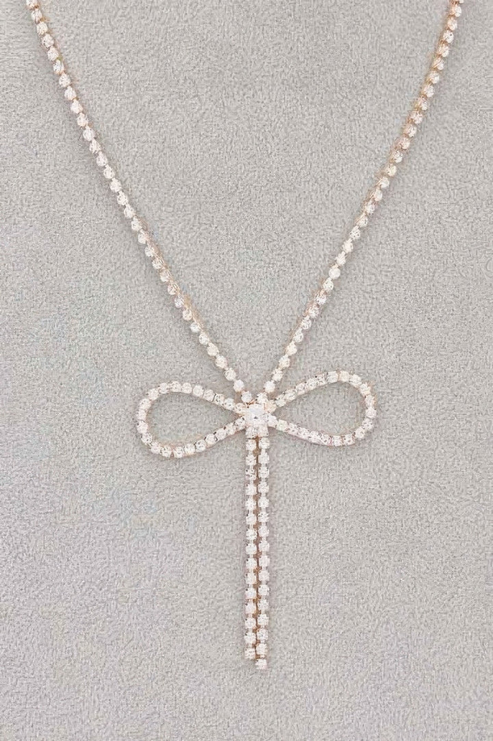 Product Description: Refined and radiant, the Rhinestone Ribbon Necklace brings a delicate sparkle to any ensemble. Featuring an elegant bow design, this necklace is adorned with shimmering rhinestones that catch the light beautifully. Its graceful silhouette rests comfortably at the collarbone, offering a sophisticated finish that's perfect for both everyday elegance and special occasions. Whether paired with a formal gown or a chic blouse, this piece adds a feminine and polished touch. Designed to stand out with subtle charm, it's a timeless addition to your jewelry collection. Product Details: Approximate length: 14.5" Features a rhinestone-encrusted bow design Sits gracefully at the collarbone for a flattering fit Lightweight and easy to wear for various occasions Adds sparkle and elegance to both casual and formal looks Ideal for gifting or enhancing your personal accessory wardrobe Size Guide: For accurate sizing guidance, please review our size chart available on the website. Shipping and Returns: Fast Shipping: We offer speedy delivery to your doorstep. Hassle-Free Returns: If you're not completely satisfied, our flexible return policy ensures your peace of mind. Rhinestone Ribbon Necklace