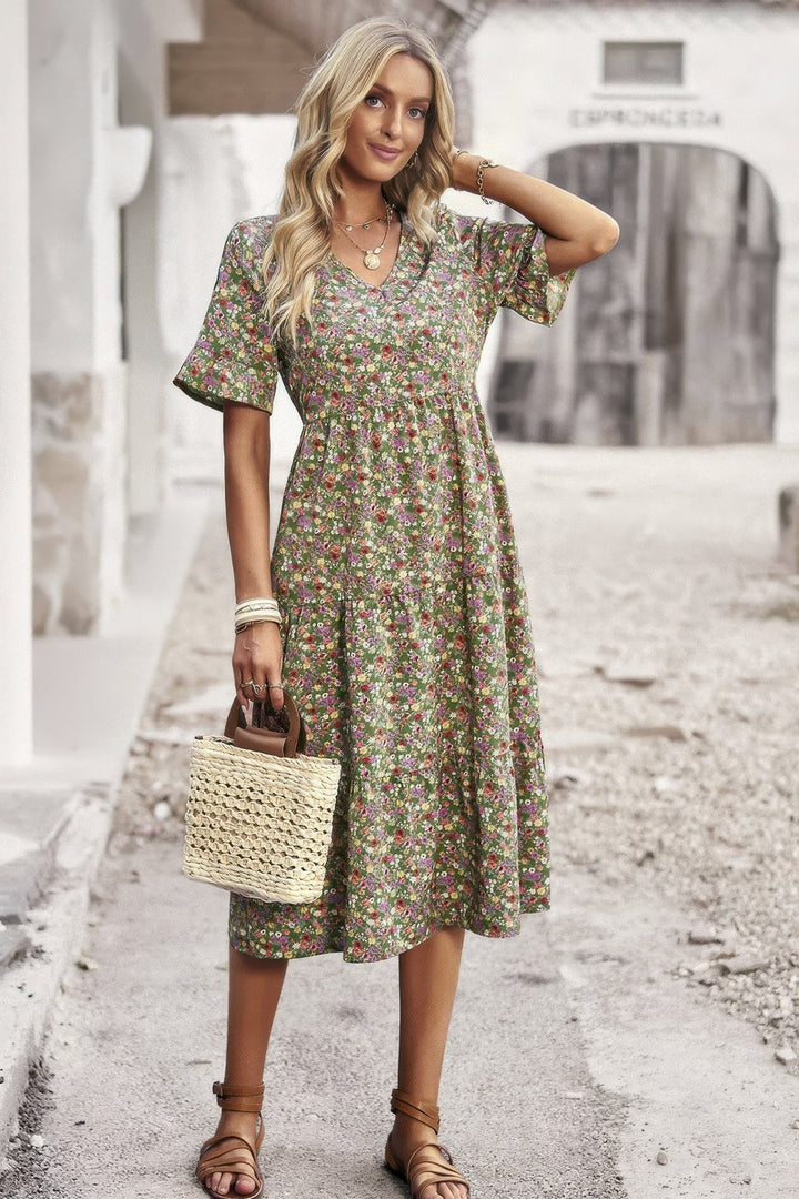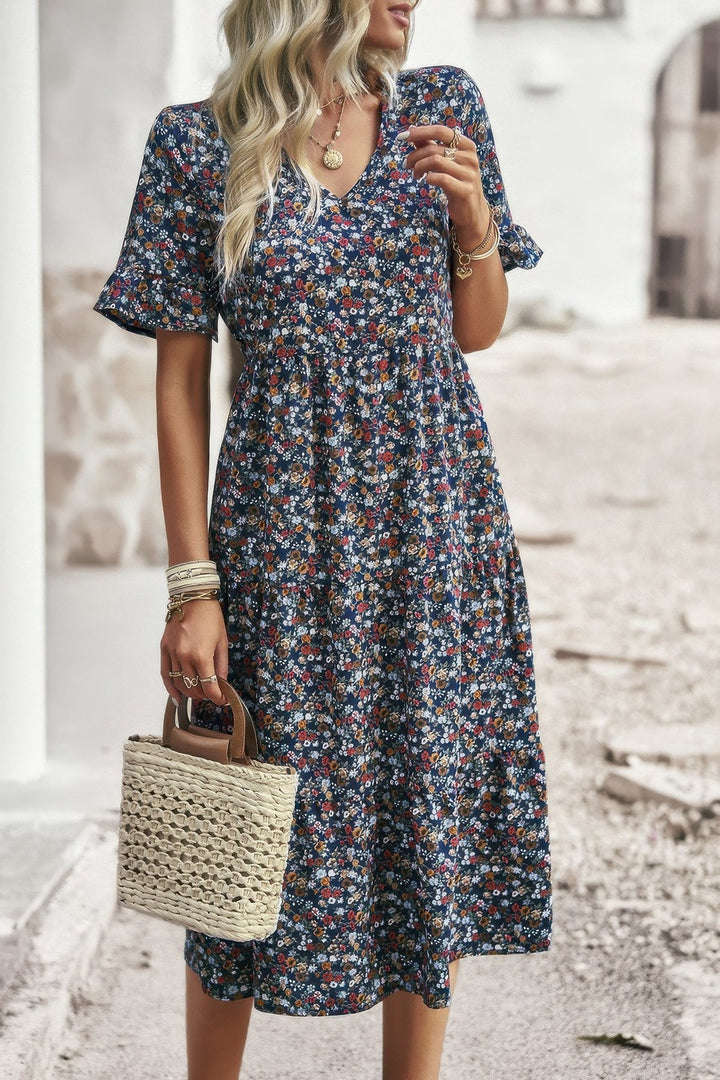 Product Description: Fresh, feminine, and full of charm, this boho-inspired floral dress is your go-to for effortless warm-weather style. Featuring a flattering V-neckline, short sleeves, and a flowy ruffle hem, it creates a relaxed silhouette with playful movement. Made from 100% polyester, it’s lightweight and breathable, perfect for staying comfortable throughout the day. The floral print adds a vibrant, free-spirited feel that’s ideal for casual outings or vacation days. Easy to dress up or down, this piece brings carefree elegance to any occasion. Product Details: Made from 100% polyester for lightweight, easy wear V-neckline adds a soft, flattering touch Short sleeves offer coverage while keeping it breezy Ruffle hem adds feminine movement and boho flair Floral print delivers vibrant, carefree style Great for casual outings, holidays, or everyday wear Size Guide: For accurate sizing guidance, please review our size chart available on the website. Shipping and Returns: Fast Shipping: We offer speedy delivery to your doorstep. Hassle-Free Returns: If you're not completely satisfied, our flexible return policy ensures your peace of mind. Boho Floral Ruffle Hem V Neck Short Sleeve Dress