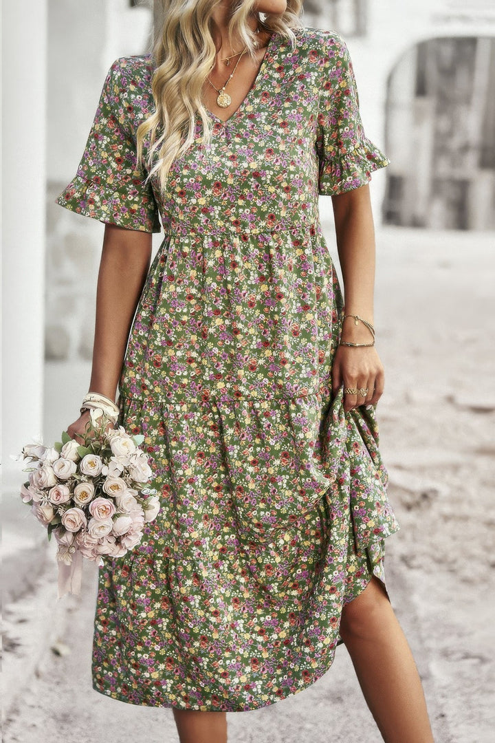 Boho Floral Ruffle Hem V Neck Short Sleeve Dress