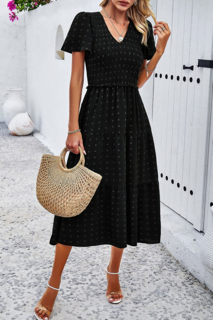 Product Description: Graceful and refined, this elegant pleated dress is designed to flatter with every detail. The ruched V-neckline and short sleeves enhance the silhouette, while the pleated skirt adds soft movement and texture. Made from 100% polyester, it offers a smooth, lightweight feel that’s perfect for day-to-evening wear. Whether you're dressing up for a special outing or keeping it polished for everyday occasions, this dress delivers timeless style with a modern edge. Product Details: Made from 100% polyester for a lightweight, comfortable fit Ruched V-neckline adds flattering shape and feminine detail Short sleeves provide soft coverage and balance Pleated skirt creates graceful movement and texture Elegant silhouette suitable for a variety of occasions Ideal for casual events, daily wear, or vacation looks Size Guide: For accurate sizing guidance, please review our size chart available on the website. Shipping and Returns: Fast Shipping: We offer speedy delivery to your doorstep. Hassle-Free Returns: If you're not completely satisfied, our flexible return policy ensures your peace of mind. Elegant Ruched V Neck Short Sleeve Pleated Dress