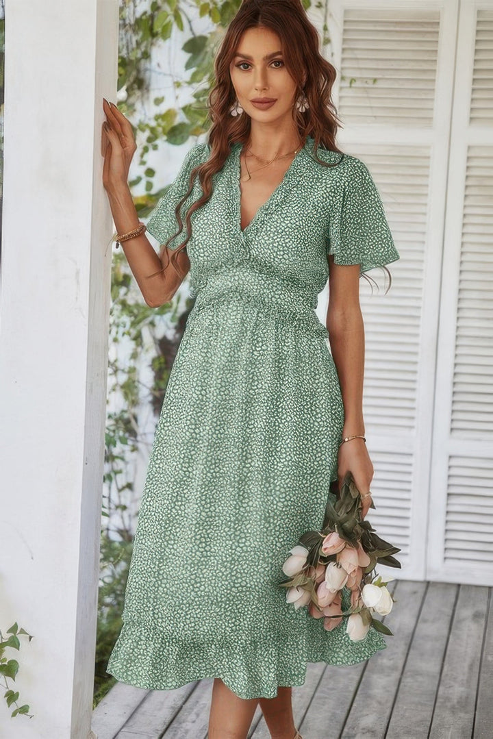 Product Description: The Deep V Neck Floral Boho Ruffle Short Sleeve Dress is a romantic and carefree piece perfect for brightening up any day. Made from 100% polyester, this dress offers lightweight comfort with a touch of bohemian charm. The deep V-neckline and empire waist create a flattering, feminine silhouette, while the short ruffle sleeves and delicate floral print bring a playful elegance. Flowing to a midi length, this dress moves beautifully with you, making it an ideal choice for everything from vacation strolls to casual weekend plans. Product Details: Made from 100% polyester for a soft, lightweight feel Deep V-neckline enhances the neckline and adds a flirty touch Empire waist flatters your shape for a feminine silhouette Short sleeves with ruffle detail for a playful, boho vibe Delicate floral print adds a romantic feel Ideal for casual outings, vacations, or relaxed gatherings Size Guide: For accurate sizing guidance, please review our size chart available on the website. Shipping and Returns: Fast Shipping: We offer speedy delivery to your doorstep. Hassle-Free Returns: If you're not completely satisfied, our flexible return policy ensures your peace of mind. Deep V Neck Floral Boho Ruffle Short Sleeve Dress