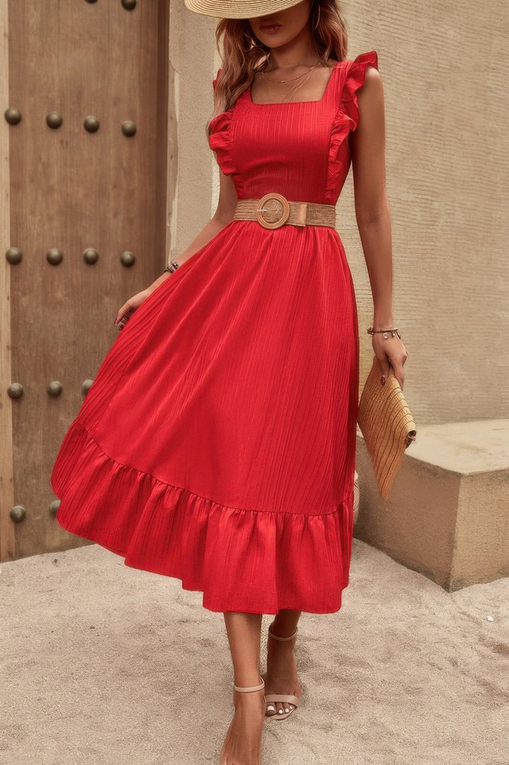 Product Description: This sleeveless ruffle cross open back knot fit dress blends contemporary style with breezy elegance. Crafted from a soft and stretchy blend of 96% polyester and 4% elastane, it offers a comfortable, flattering fit for warm-weather days. The cross open back design adds a striking, playful twist, while the delicate ruffle detailing and knotted fit ensure a feminine silhouette. Perfect for sunny outings, vacation plans, or weekend get-togethers, this dress pairs effortlessly with sandals or wedges for a polished, flirty finish. Product Details: Made from 96% polyester and 4% elastane for comfort and stretch Sleeveless design for breezy, warm-weather wear Cross open back detail for a striking, stylish look Delicate ruffle accents for a feminine touch Knotted fit at the waist for a flattering silhouette Ideal for casual outings, vacations, or everyday wear Size Guide: For accurate sizing guidance, please review our size chart available on the website. Shipping and Returns: Fast Shipping: We offer speedy delivery to your doorstep. Hassle-Free Returns: If you're not completely satisfied, our flexible return policy ensures your peace of mind. Sleeveless Ruffle Cross Open Back Knot Fit Dress