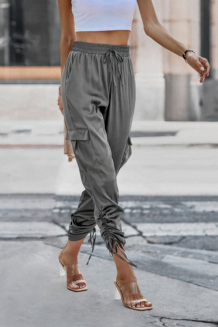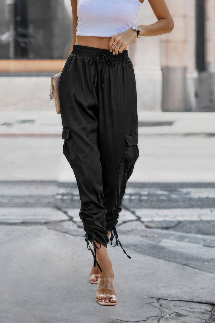 Solid Drawstring Hem Flap Pocket Side Stacked Pant
