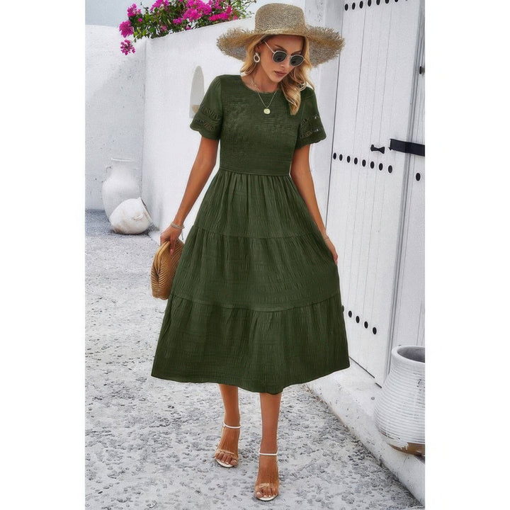 Product Description: Feminine and flattering, this Lace Round Neck Ruched Fit Ruffle Solid Dress is designed to elevate your everyday style with subtle elegance. Featuring a delicate lace round neckline and soft ruching along the bodice, it contours your shape while maintaining a comfortable fit. The ruffle detailing adds movement and charm, making it an ideal choice for everything from casual outings to weekend getaways. Crafted from a smooth polyester-elastane blend, this dress offers stretch, durability, and all-day ease in a solid, versatile hue. Product Details: Made from 98% Polyester, 2% Elastane for soft stretch and structure Lace round neckline adds a romantic, refined touch Ruched bodice offers a flattering, body-enhancing fit Ruffle accents bring movement and feminine detail Solid color makes it easy to accessorize for various occasions Suitable for daily wear, casual events, or vacations Size Guide: For accurate sizing guidance, please review our size chart available on the website. Shipping and Returns: Fast Shipping: We offer speedy delivery to your doorstep. Hassle-Free Returns: If you're not completely satisfied, our flexible return policy ensures your peace of mind. Lace Round Neck Ruched Fit Ruffle Solid Dress