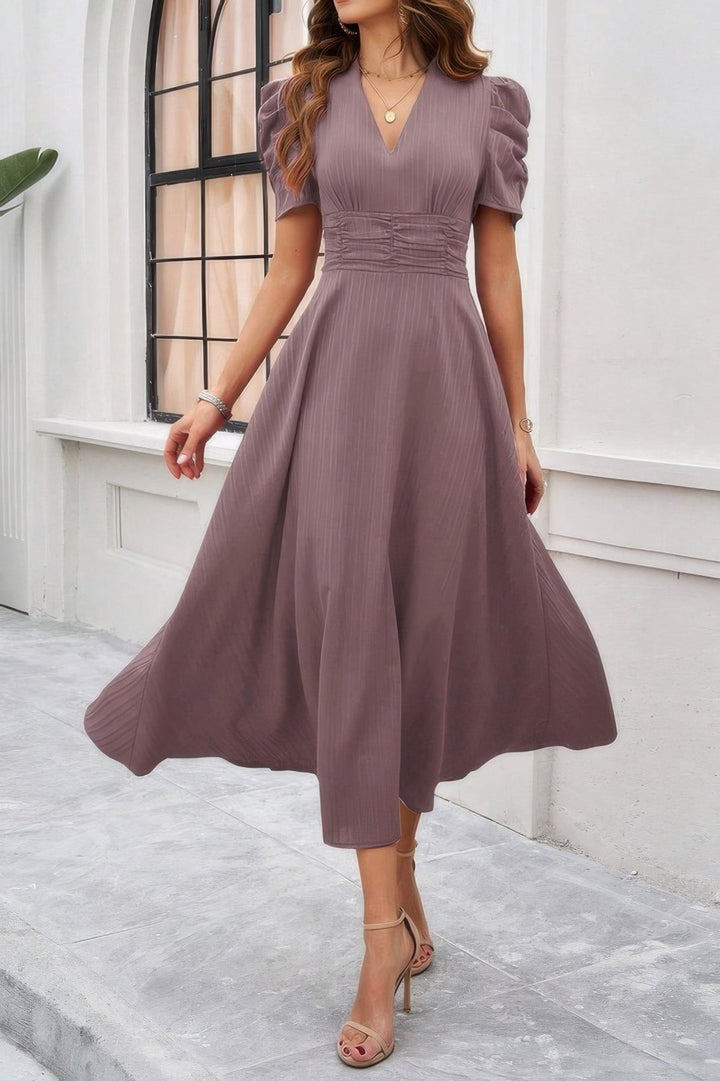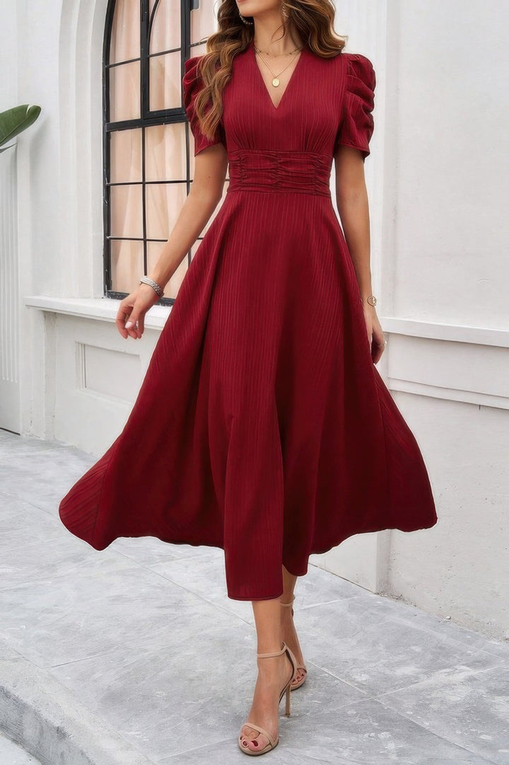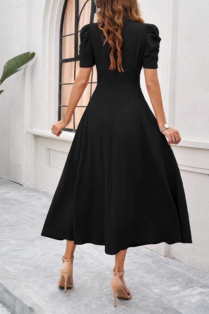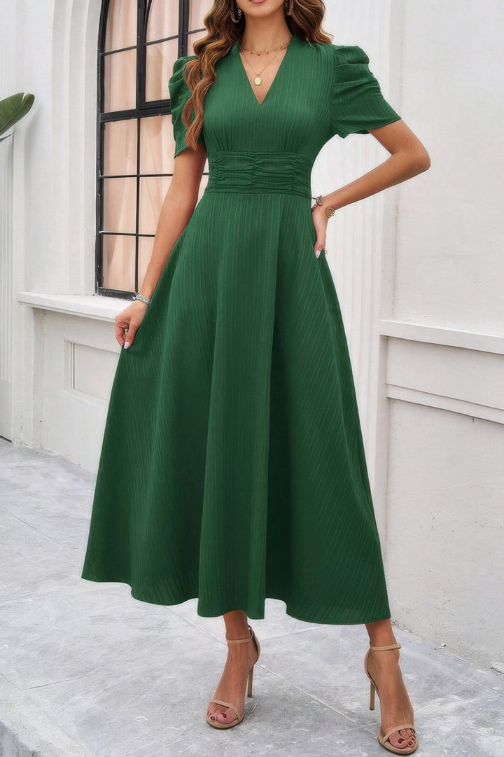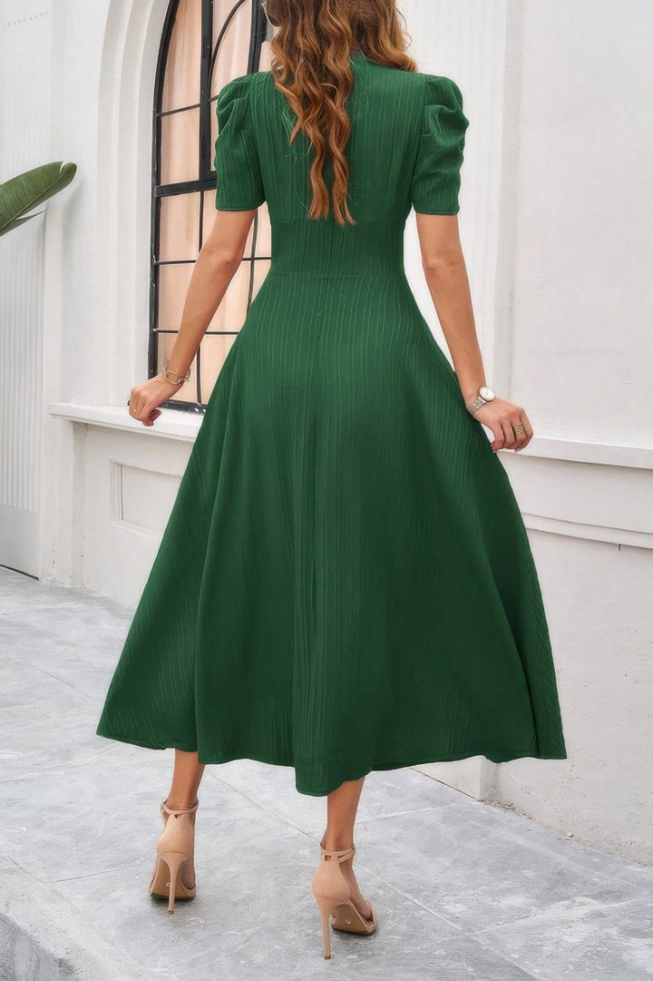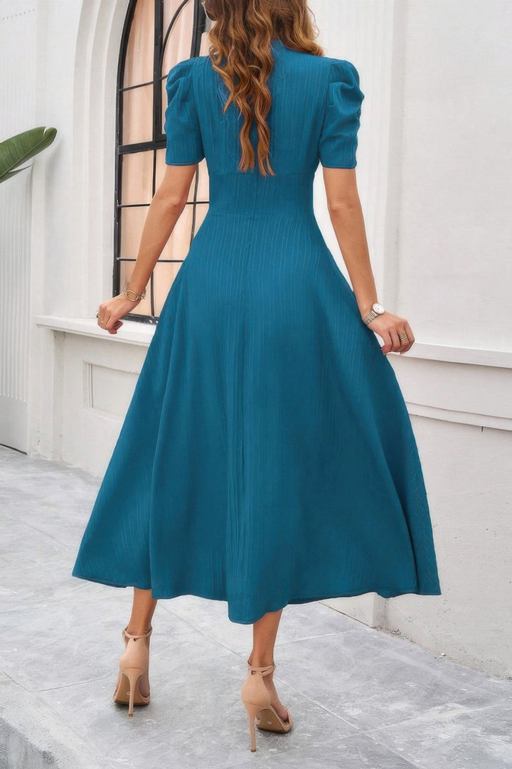 Product Description: Timeless and flattering, this V-Neck Solid Puff Sleeves Fit Full Dress brings graceful structure to everyday dressing. Featuring a classic V-neckline and elegant puff sleeves, it balances femininity with a tailored silhouette. The fitted bodice flows into a full skirt, offering movement and ease with every step. Made from a soft, stretchy polyester-elastane blend, this dress combines comfort with a polished finish—ideal for everything from casual outings to daytime events. Product Details: Made from 96% Polyester, 4% Elastane for softness and stretch V-neckline offers a clean, elongating look Puff sleeves add volume and refined detail Fitted bodice with full skirt for a balanced silhouette Solid color design for easy styling and accessorizing Great for daily wear, vacations, or casual gatherings Size Guide: For accurate sizing guidance, please review our size chart available on the website. Shipping and Returns: Fast Shipping: We offer speedy delivery to your doorstep. Hassle-Free Returns: If you're not completely satisfied, our flexible return policy ensures your peace of mind. V Neck Solid Puff Sleeves Fit Full Dress