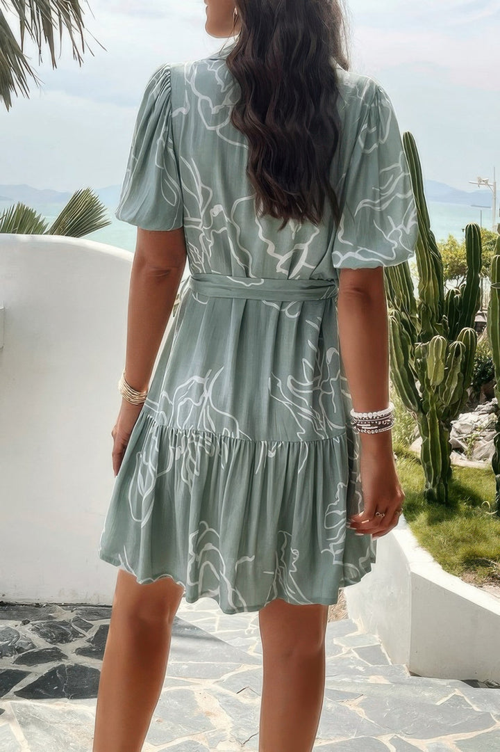 Random Print Button Down Belt Ruffle Midi Dress