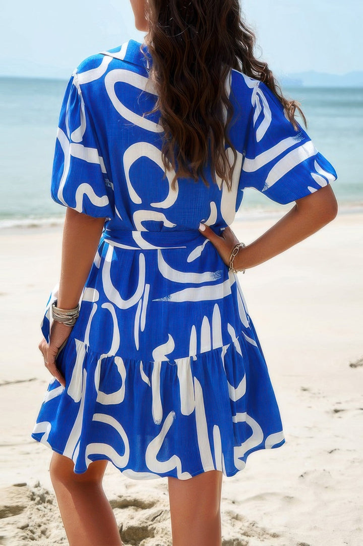 Random Print Button Down Belt Ruffle Midi Dress